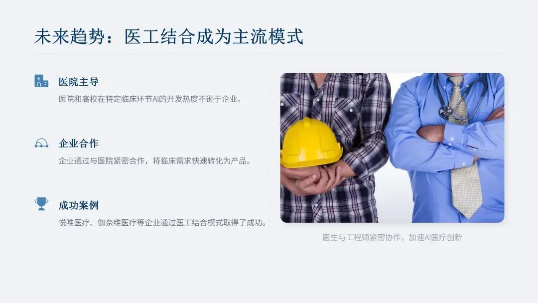 医工结合成为医疗人工智能应用开发的主流模式。医院、高校对特定临床环节 AI 的开发热度不逊于企业,已有不少企业通过与医院紧密合作收获阶段性成果,如悦唯医疗的 SYNTAX 智能评分系统、伽奈维医疗的复合陡脉冲治疗系统、京东健康的京医千询 2.0 等,随着医工结合深入,行业将涌现更多成功案例。