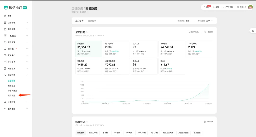 微信小店电商罗盘,是帮助商家和达人进行经营决策的数据分析工具,包含商家版和达人版。