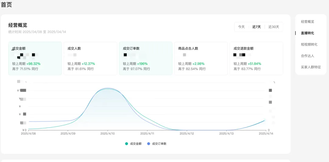 包含5大模块:经营概览、自营直播转化、自营短视频转化、合作达人、买家人群特征。帮助商家概览近期的交易情况以及变化,再具体定位到自营业务还是达人合作业务拆解分析。