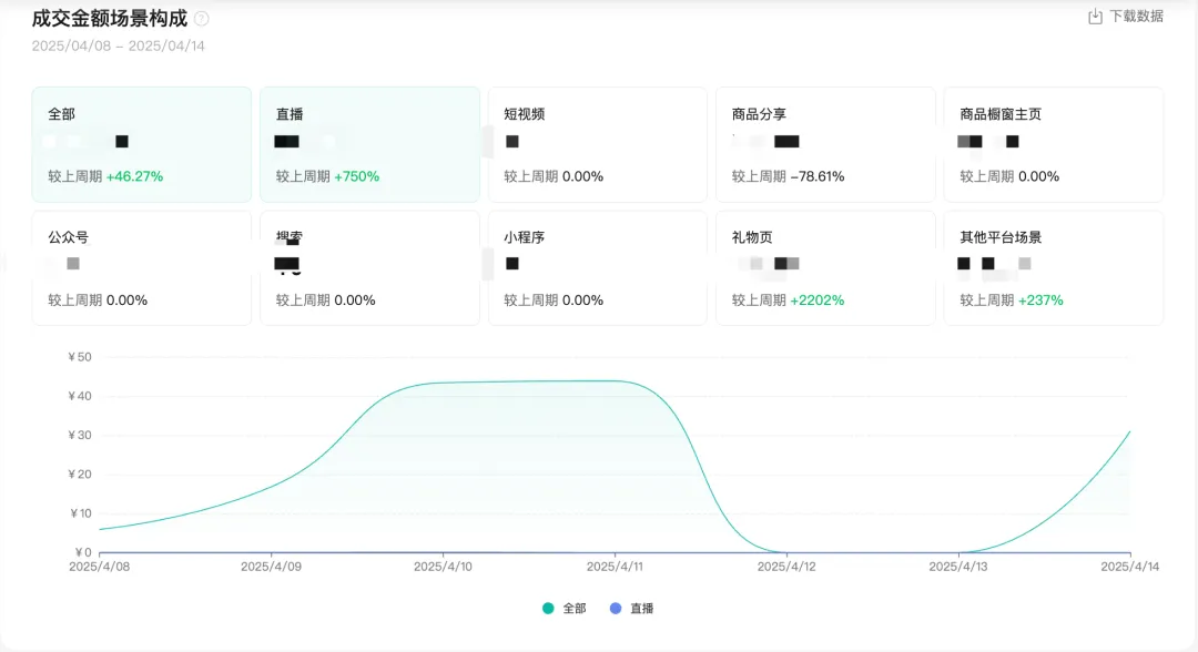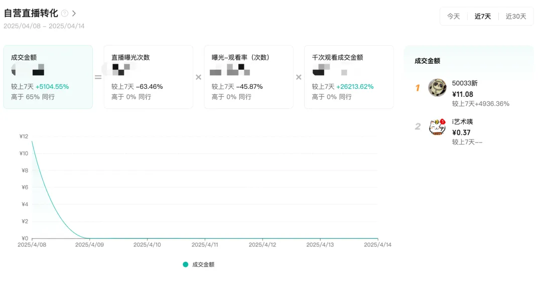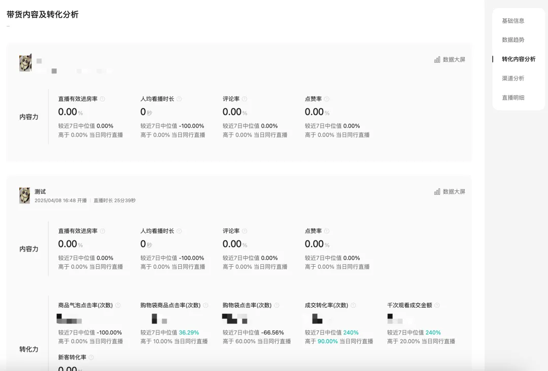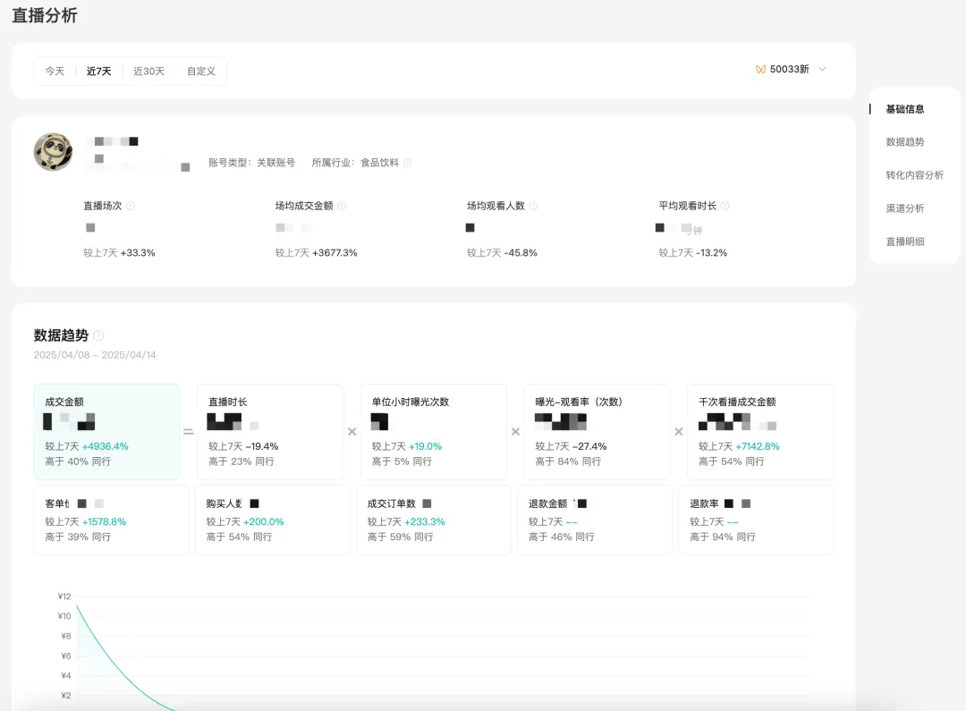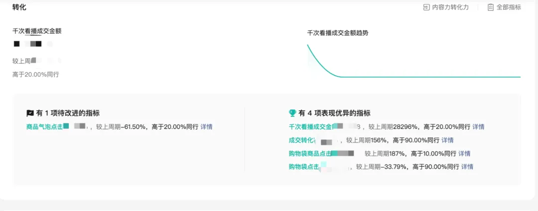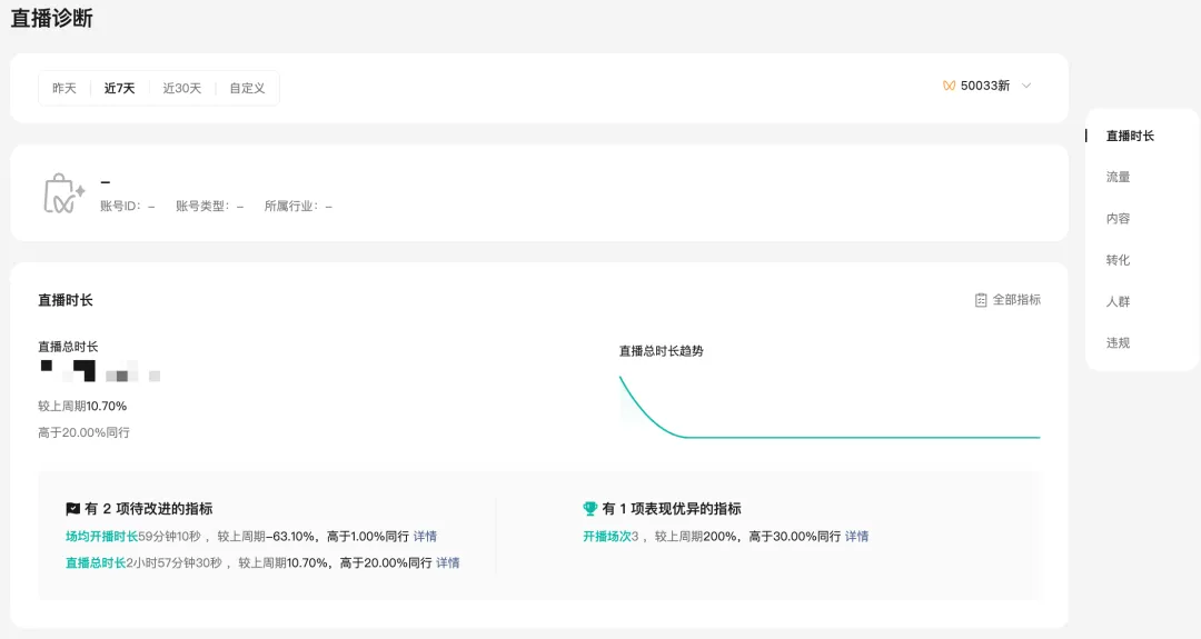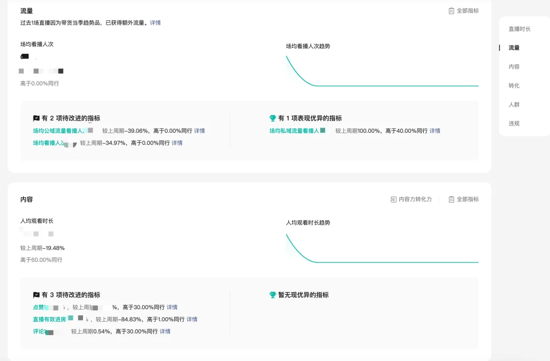 包括近期店铺绑定关联账号的开播直播间的流量数据、转化数据、流量来源渠道,以及主播关注的公域流量竞争力,通过直播的内容力、转化力和同行的对比,可以知道自身直播间在当日竞争力如何,进而优化对应的表现。