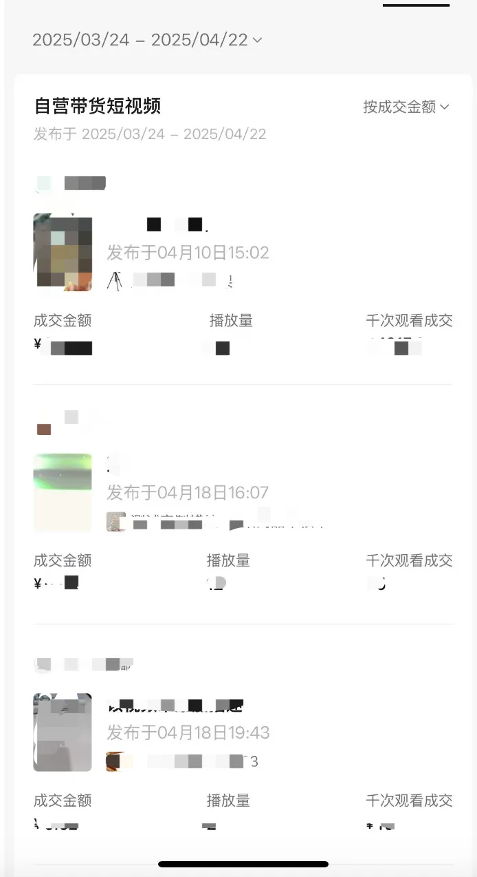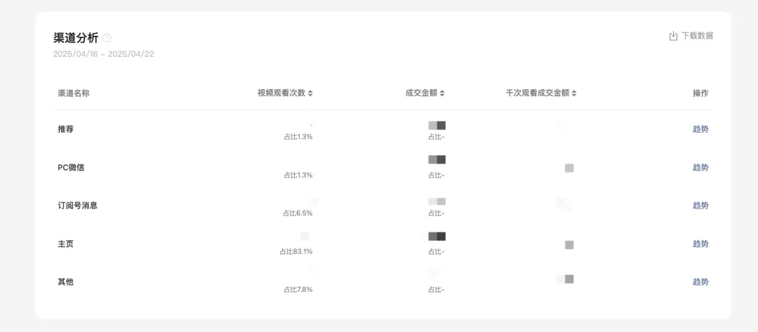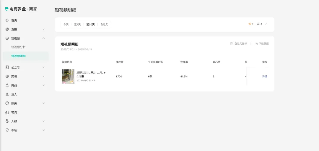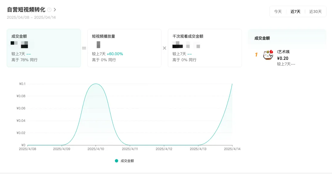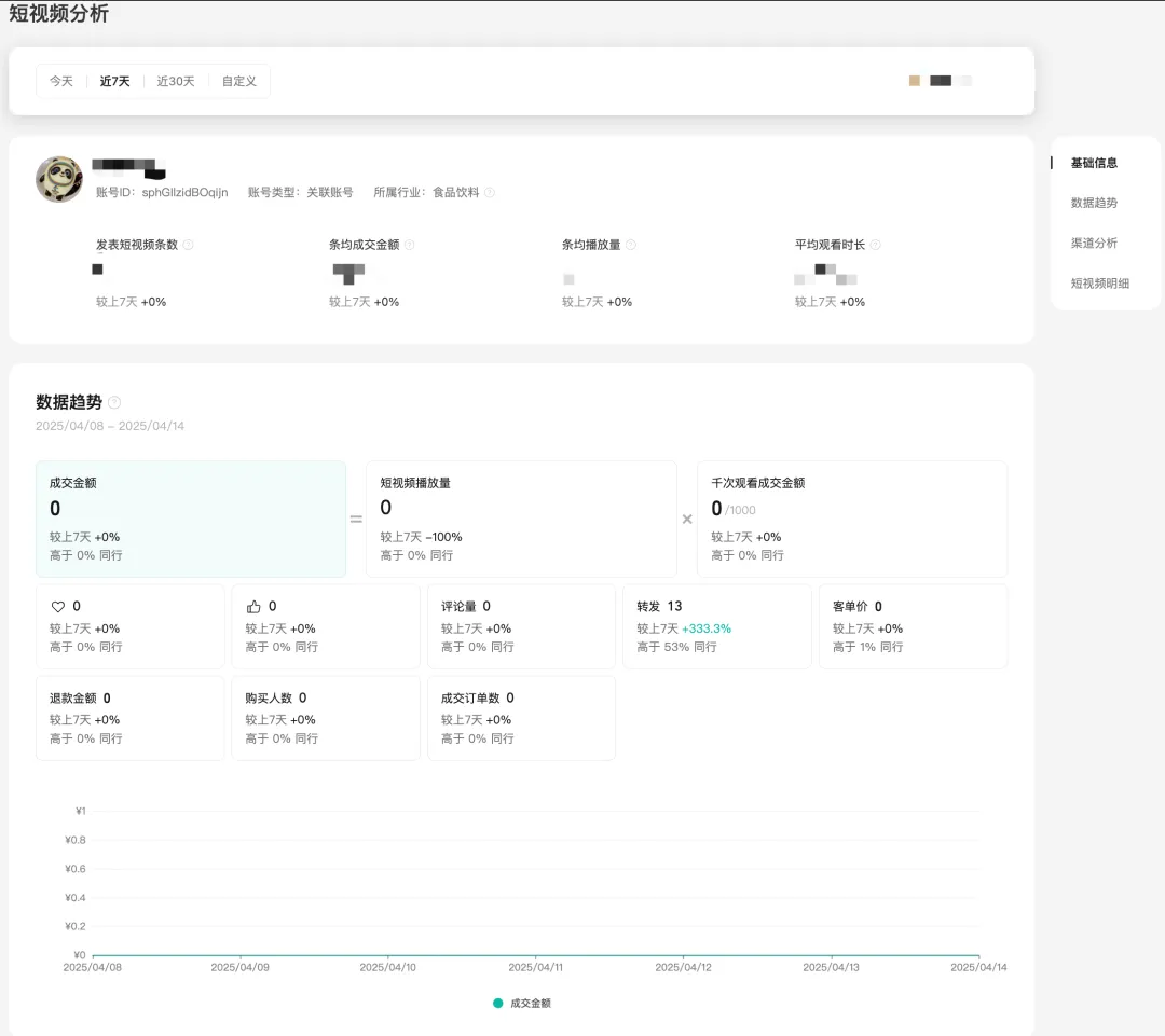 支持查看近期店铺绑定关联账号的短视频的流量、互动、带货趋势,以及不同渠道的播放和转化数据。