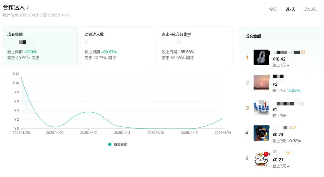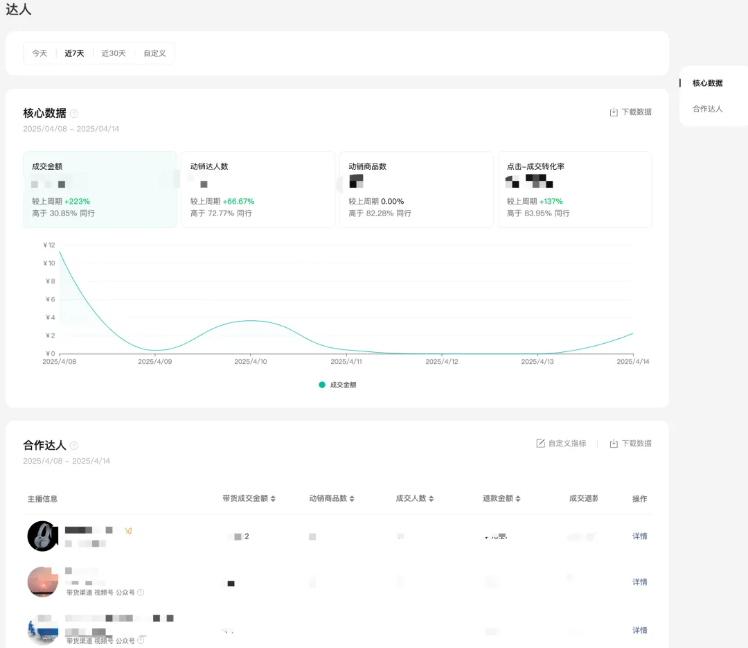 支持店铺查看达人带货店铺商品产生的数据,帮助商家及时发现潜力达人,发现达人的强势带货场景,定向推更合适的商品,不错过进一步深度合作的机会。