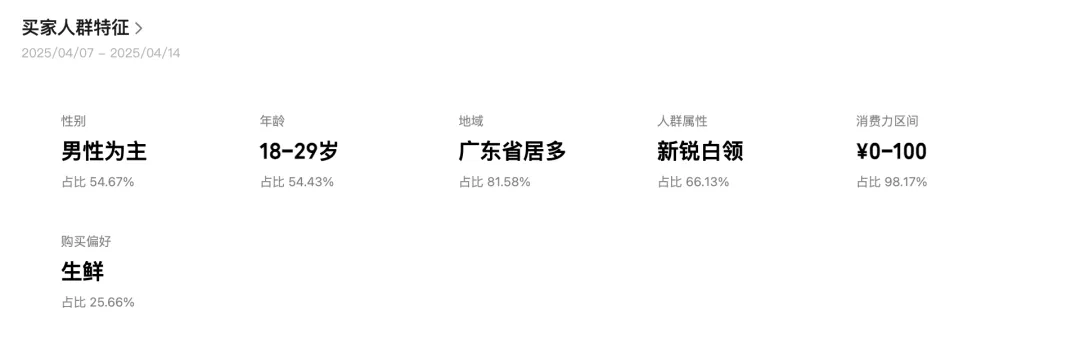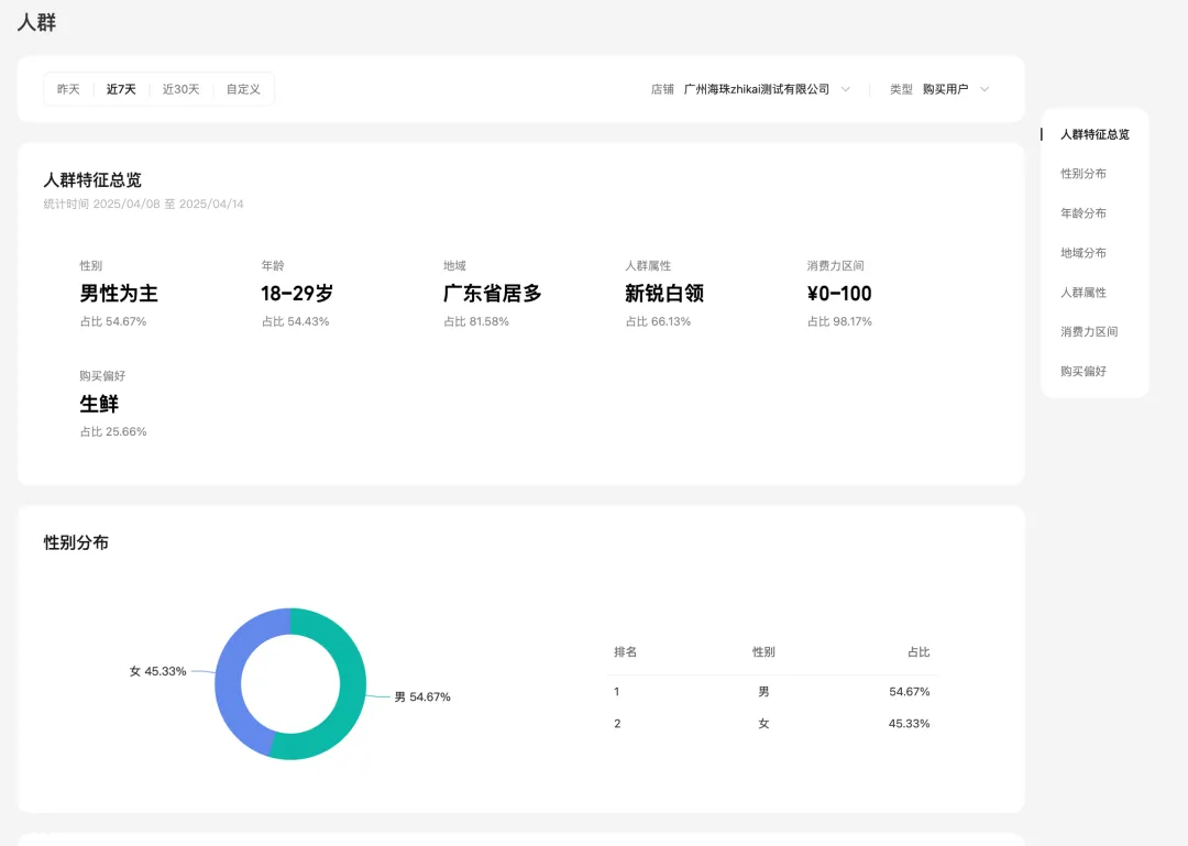 各类用户类型的用户特征分布,帮助商家对用户洞察更深,更好的去开发商品、做好内容,目前支持这几个维度用户查看:商品曝光用户、商品点击用户、购买用户、首购用户、复购用户。