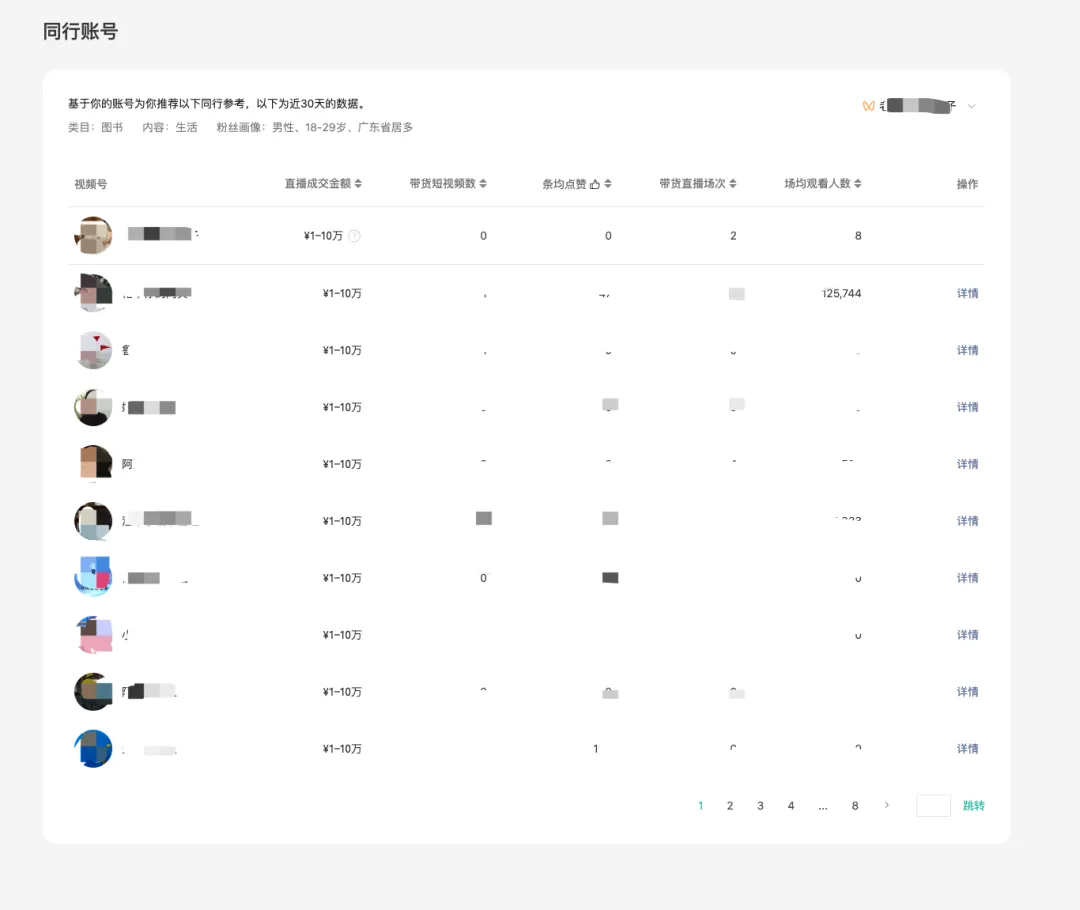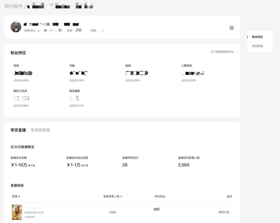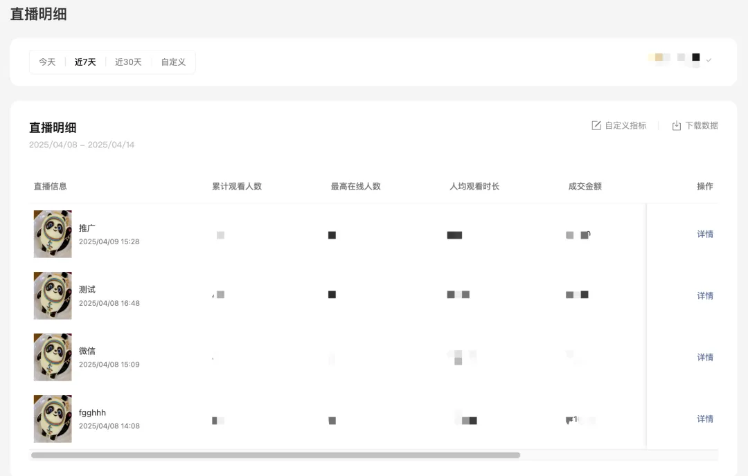 近期直播的列表明细,包括带货和非带货直播间的核心数据,点击「详情」支持查看本场直播的数据大屏。