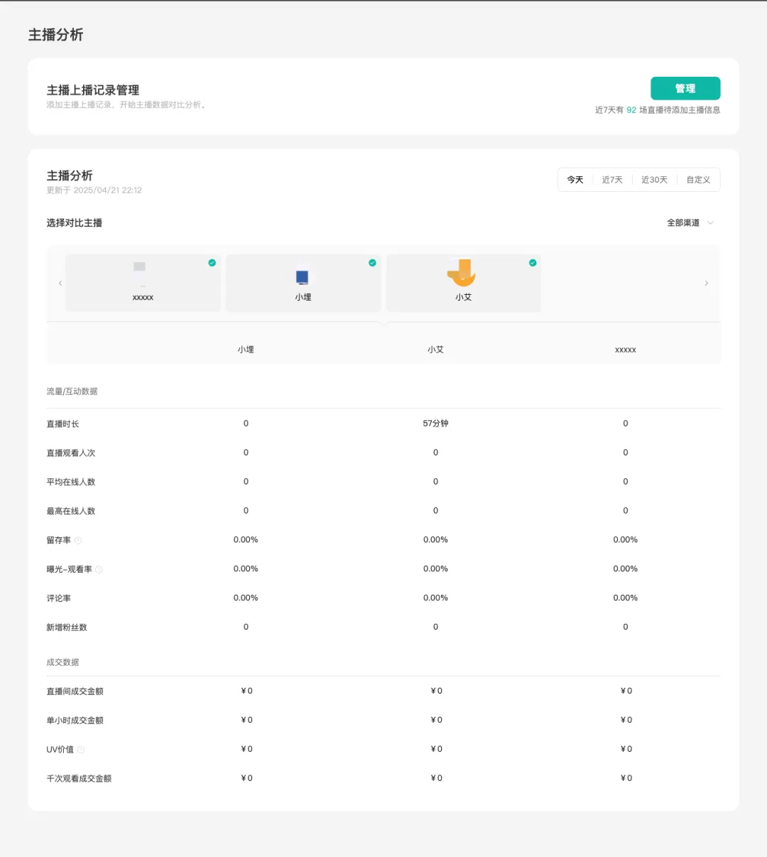 近期主播数据业绩分析能力,直接创建账号的主播昵称,并标记在某场直播里主播在播的时段,平台将自动将这段时间的直播表现和业绩归到主播,你只需筛选查看哪些主播在近期的数据,就能对比不同主播的表现。适合有多主播轮播的商家直播间。