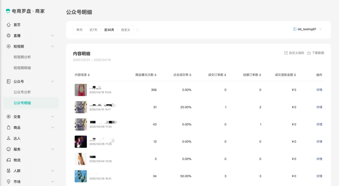 支持查看店铺关联账号在近期的交易数据和短视频带货列表。