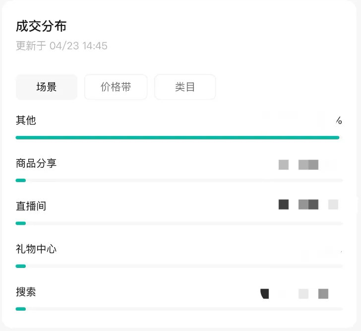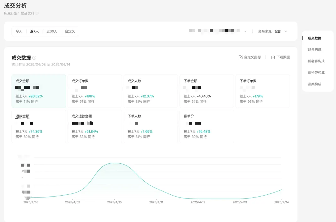商家可查看基础的成交数据、场景/价格带/类目/交易新老客分布。