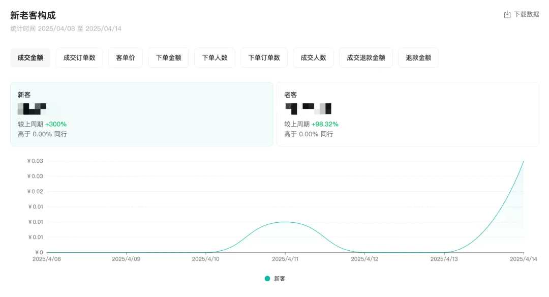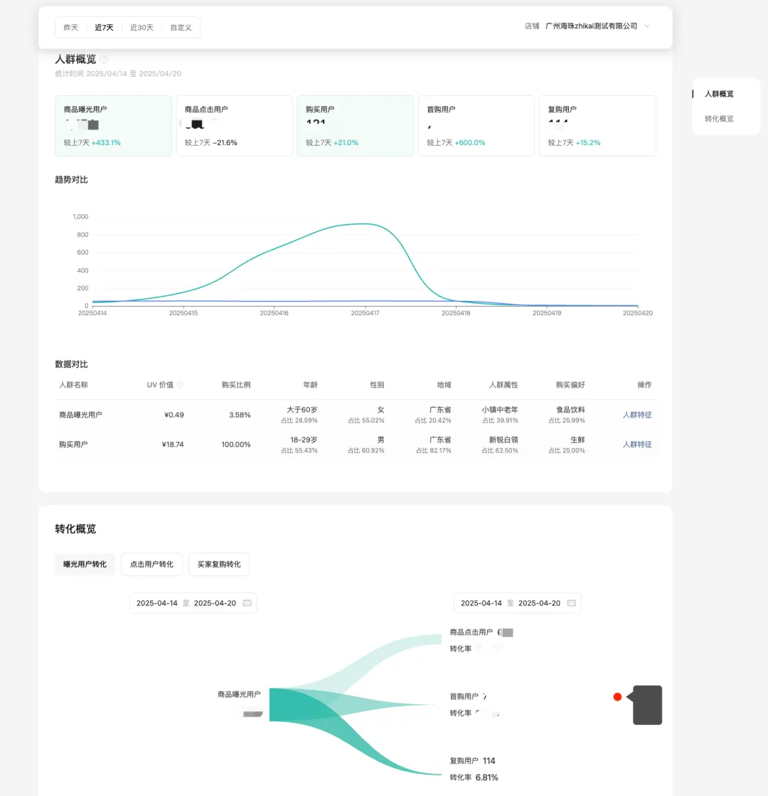 店铺各项用户资产数据概览,帮助商家定位触达用户、新用户、老用户的变化数据。