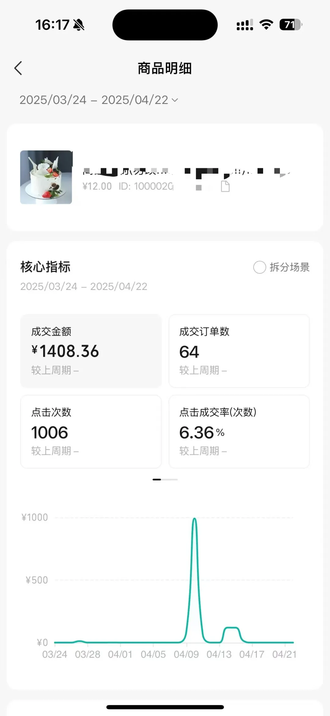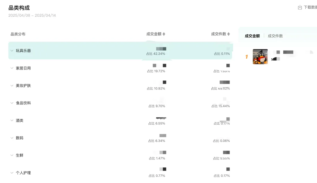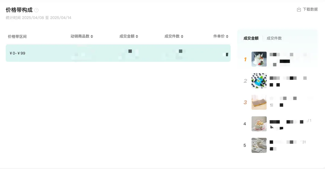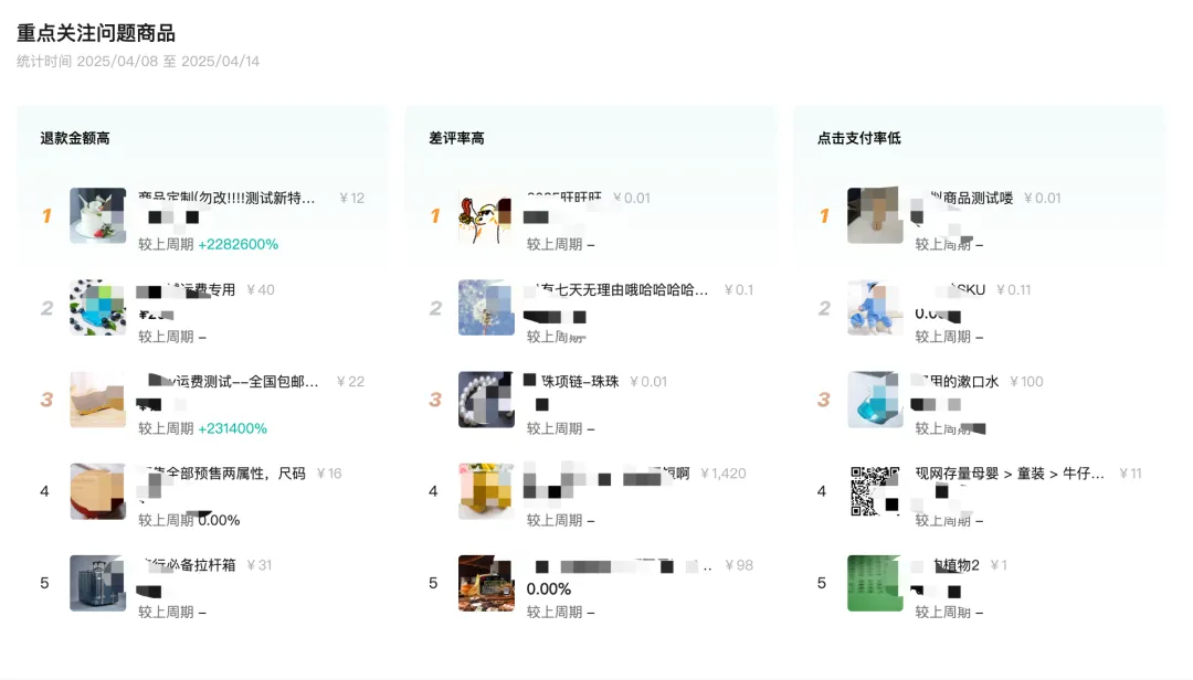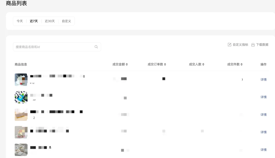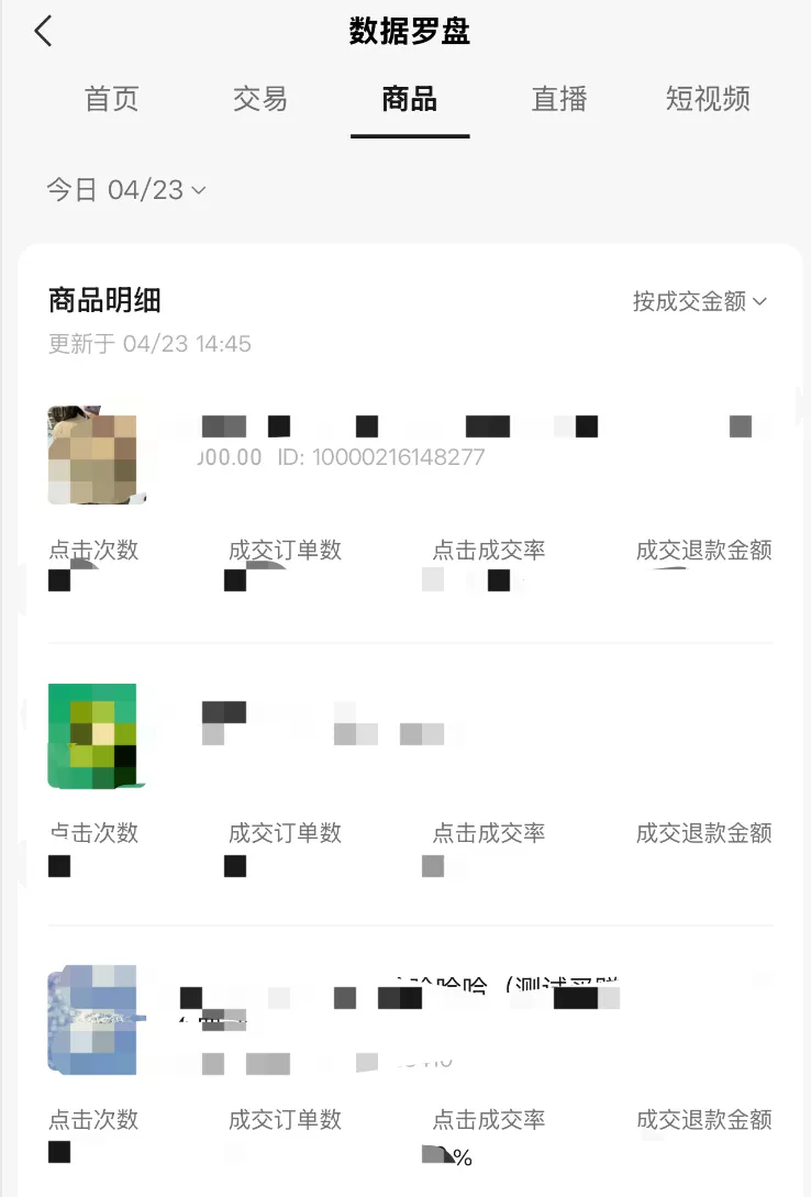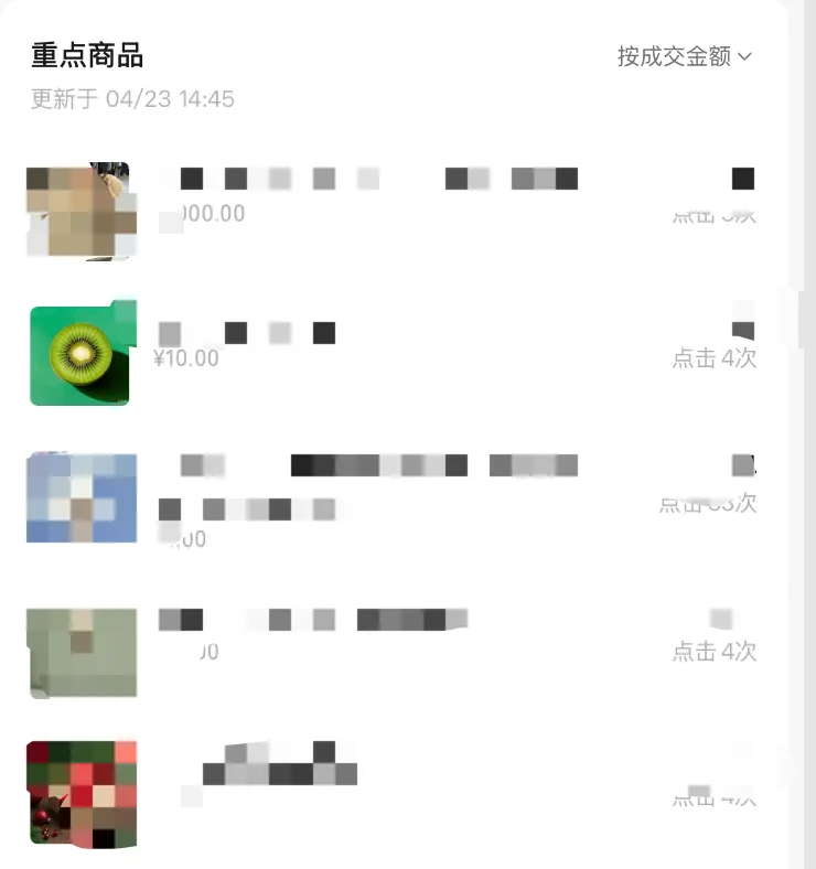 店铺的售卖商品列表及商品明细模块,支持按照成交金额、点击次数、成交退款金额等指标排序。