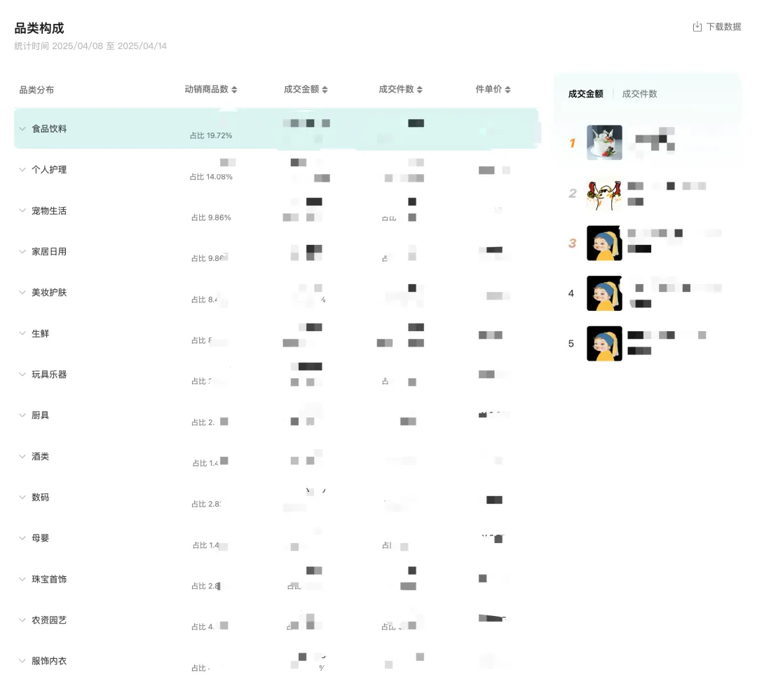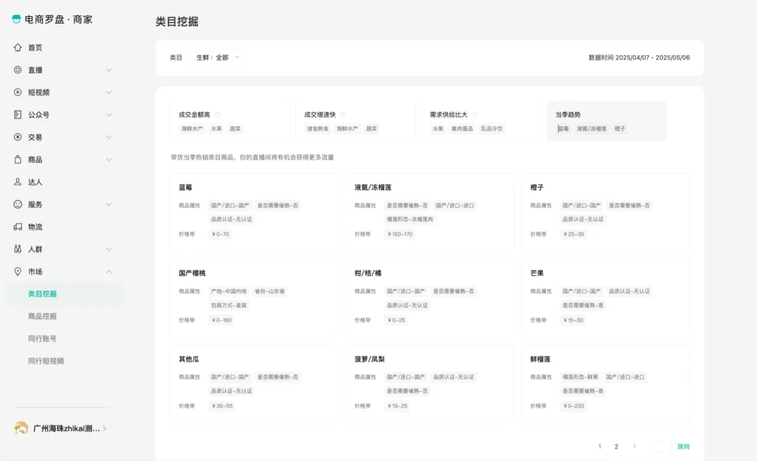 对于想要开拓新的品类经营,或者不清晰平台近期好卖类目的达人,平台提供了类目挖掘能力,帮助达人从成交金额(热销)、成交增速(高增长潜力)、需求供给比(用户需求强,但供给相对少)、当季趋势(平台预估当季节用户需求将提升的类目)几个维度去找到想要的类目,并支持点击到具体类目查看在平台销售的往期数据。