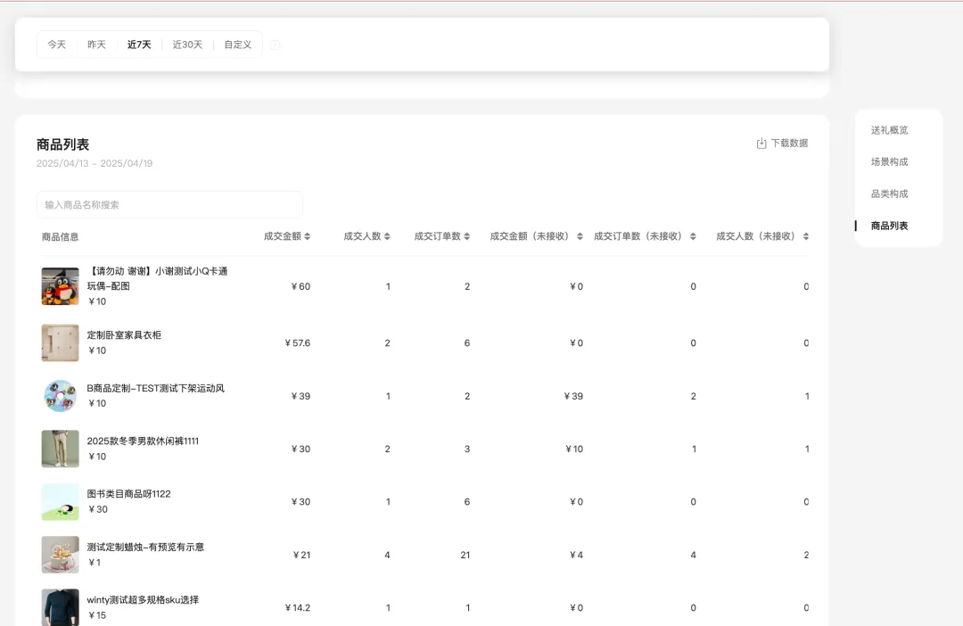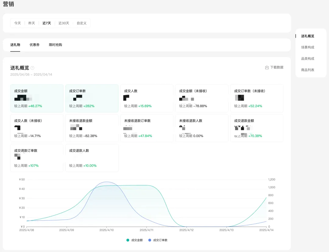 送礼概览支持查看店铺送礼功能的交易、退款数据,退款包括用户超时未收礼自动退款,以及用户主动退款。