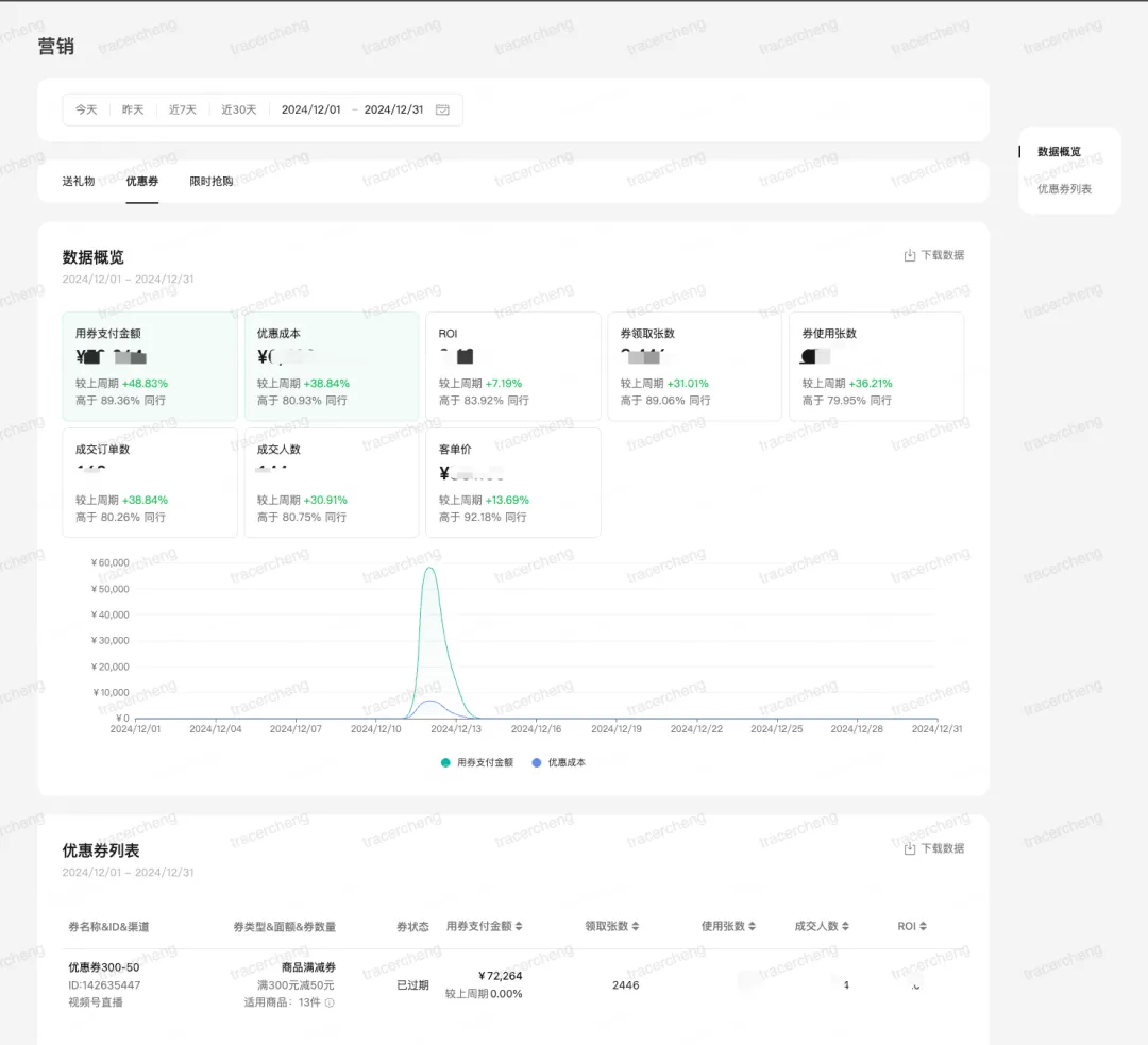 优惠券模块支持商家查看每个优惠券的详细领券、核销、ROI等数据,