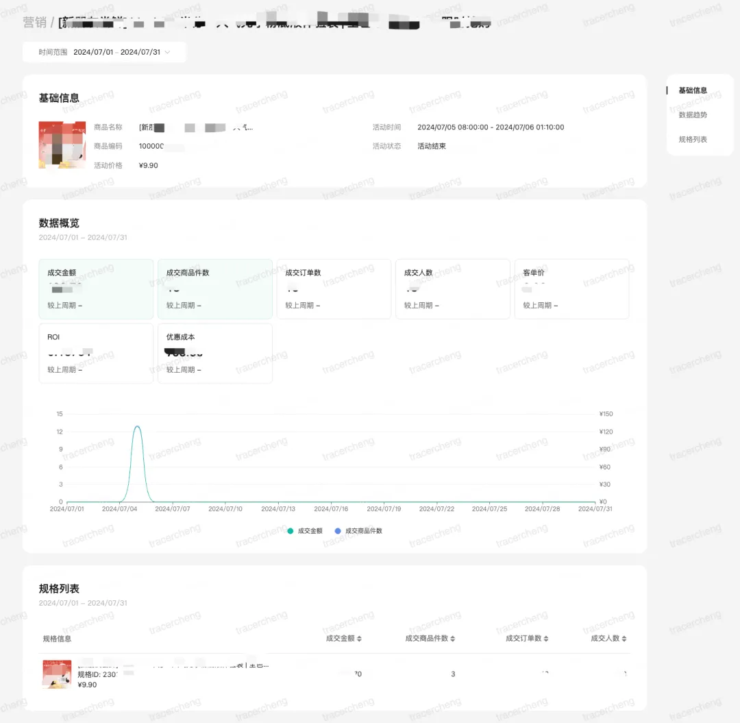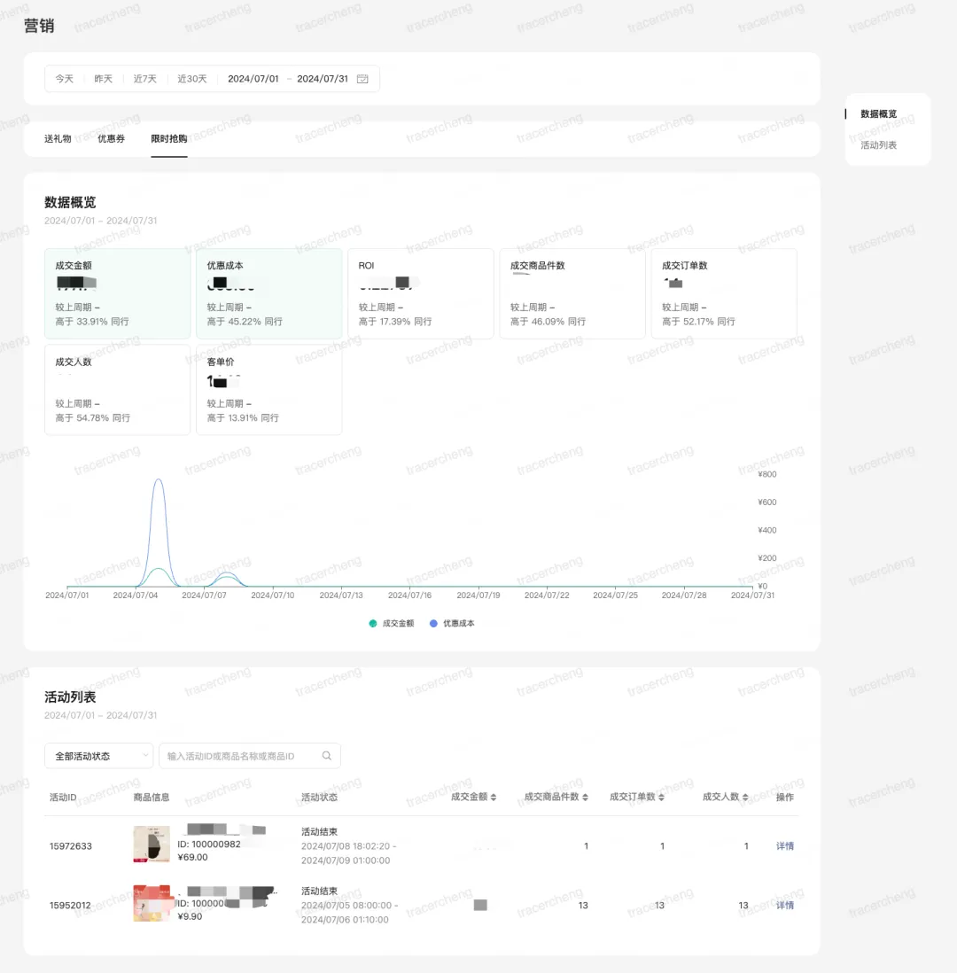 限时抢购模块支持商家查看设置的活动详细成交数据及ROI。