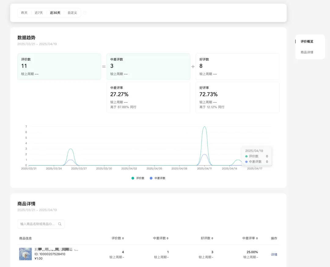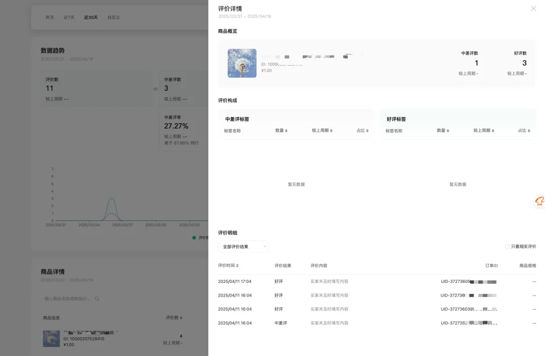 店铺查看用户评价数据,包括商品评价的明细,帮助判断好差评的来源。