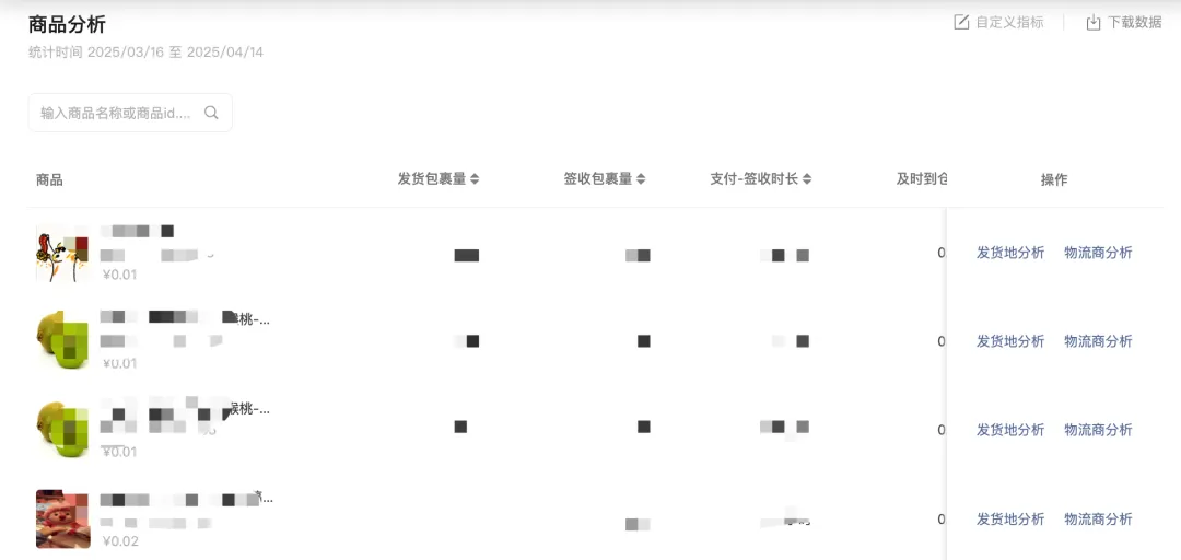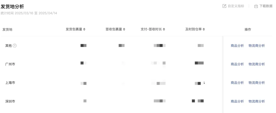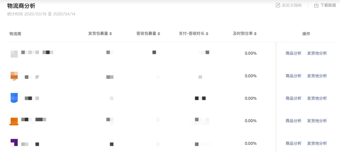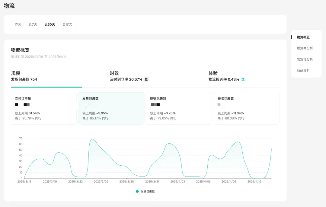 物流模块支持查看店铺的包裹量、发货/揽收/签收时效、物流投诉/退货率等数据,如果商家想要分析不同发货地和物流商的发货时效,罗盘同样提供了对应数据,同时你也可以针对单个商品的发货地和服务商进行针对性分析优化。