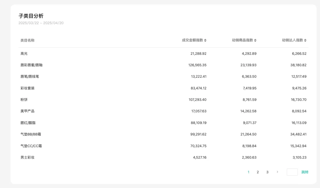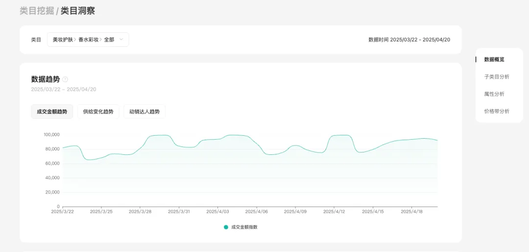 查看具体某个类目在平台的往期销售特征。商家可以在平台查看该类目成交趋势,如果成交趋势在上升,说明类目在平台逐渐变得热销,但竞争可能同样激烈,如果你想切入一些蓝海类目,同样也可以关注需求供给变化趋势和动销达人趋势,如果需求供给比提升,说明用户需求的增长,比商品供给的增长更快。同样动销达人如果涨幅不大,但成交一直增长,说明类目有潜力,可以给到更多达人推广,来扩大动销。