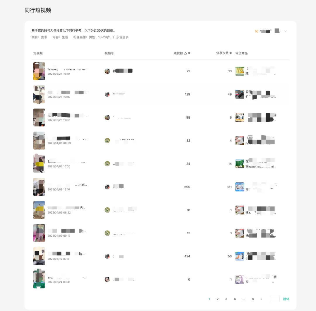 店铺关联账号的直播、短视频,以及基于关联账号的推荐参考账号和短视频素材。