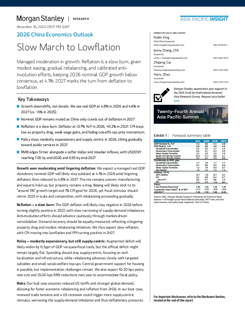 摩根士丹利正式发布《2026年中国经济展望报告》,深入剖析了中国经济在复杂国际环境与国内结构转型背景下的增长前景、政策导向及行业趋势。报告指出,2026年中国经济将呈现“温和增长与结构转型并行”的特征,实际GDP增速预计为4.4%-4.8%,名义GDP增速约为4.1%,通缩压力逐步缓解但低通胀成为常态,政策重心从“稳增长”转向“调结构与促改革”。