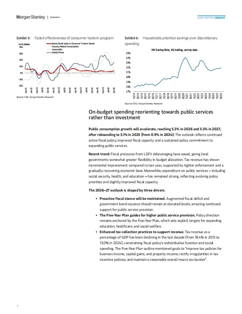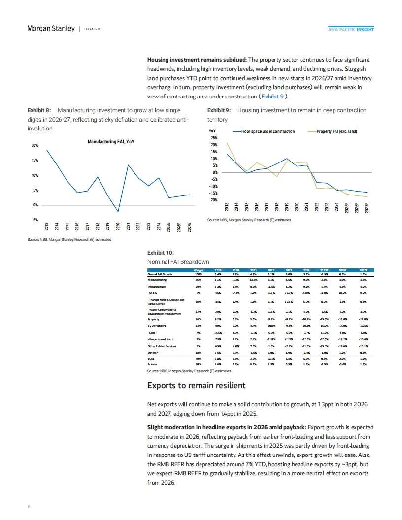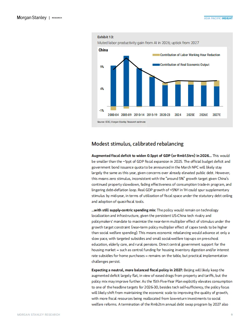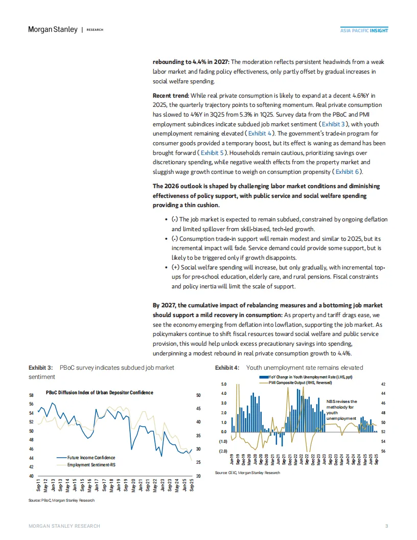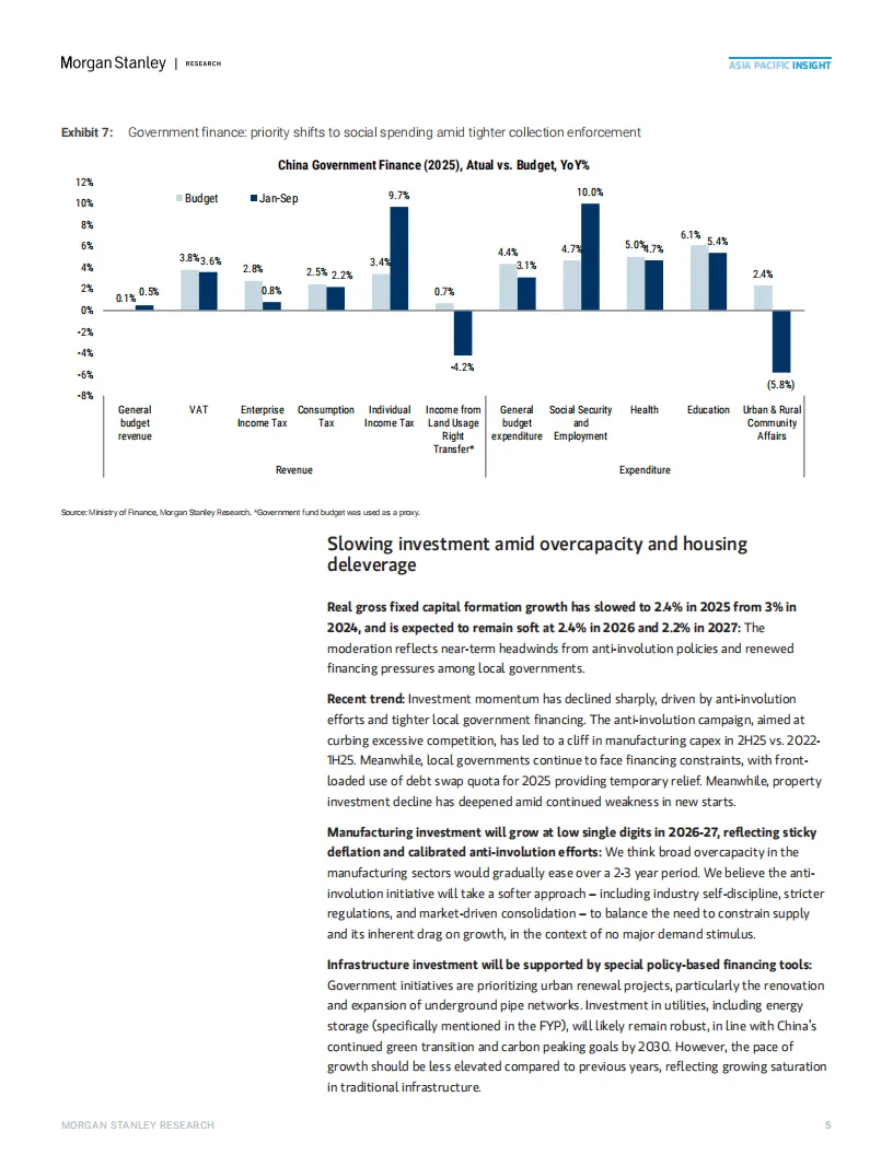 摩根士丹利预测,2026年中国经济增速将呈现“前高后稳”态势:一季度受基建投资拉动,环比折年率可能达6.5%,但后续因消费和投资动力不足,全年增速将逐步回落至3.6%-4.4%。报告强调,内需疲软是主要拖累因素: