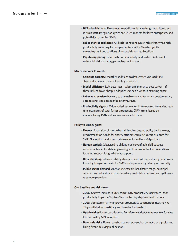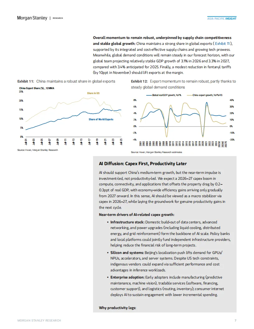 人工智能:AI相关资本开支将迎来爆发式增长,数据中心、先进网络和电力升级等基础设施投资,以及制造业(预测性维护、机器视觉)和服务业(金融、客服)的应用拓展,将成为宏观经济的“稳定器”。摩根士丹利预测,AI投资将抵消0.2-0.3个百分点的房地产拖累。