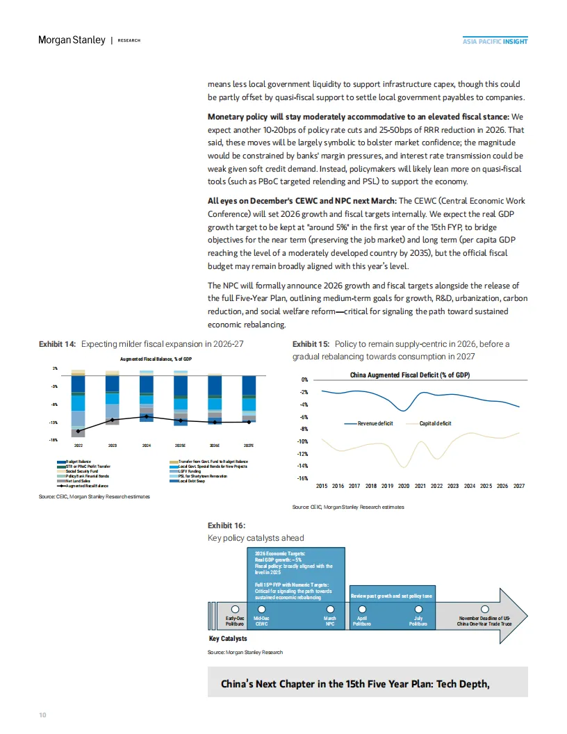 财政政策:广义赤字率扩大0.5个百分点,通过专项债和政策性银行工具支持基建投资,但官方赤字率保持稳定。支出结构向技术自主可控和公共服务倾斜,同时通过定向补贴推进渐进式再平衡。