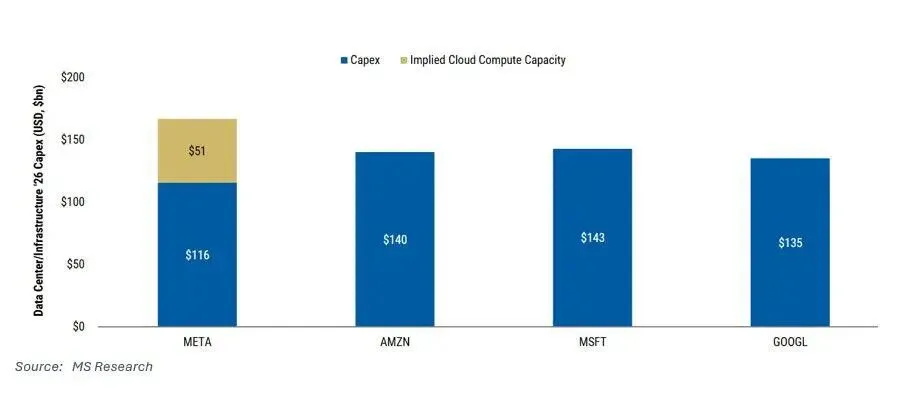 摩根士丹利对各家公司2026年资本开支的预期显示,科技巨头正在进行史无前例的投资扩张。