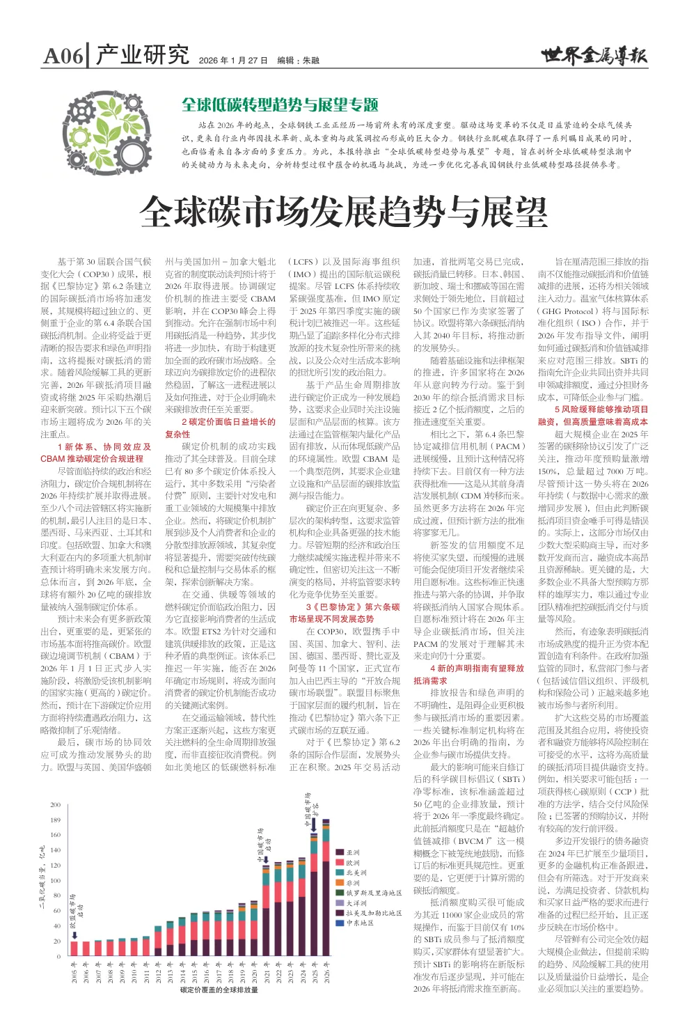 站在2026年的起点,全球钢铁工业正经历一场前所未有的深度重塑。驱动这场变革的不仅是日益紧迫的全球气候共识,更来自行业内部因技术革新、成本重构与政策调控而形成的巨大合力。钢铁行业脱碳在取得了一系列瞩目成果的同时,也面临着来自各方面的多重压力。为此,本报特推出“全球低碳转型趋势与展望”专题,旨在剖析全球低碳转型浪潮中的关键动力与未来走向,分析转型过程中蕴含的机遇与挑战,为进一步优化完善我国钢铁行业低碳转型路径提供参考。