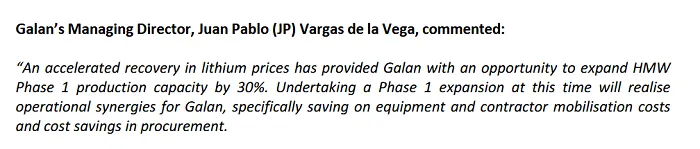 GLN董事总经理Juan Pablo (JP) Vargas de la Vega表示,一期扩产正当其时,锂价的加速回升为Galan带来将HMW一期产能扩大30%的难得机遇。