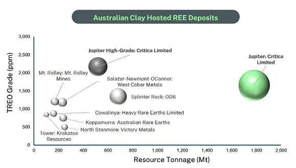 Jupiter项目被Critica定义为“澳洲最大的黏土型磁性稀土资源”, 总资源量18亿吨,总稀土氧化物(TREO)含量1,700 ppm,含钕、镨、镝、铽等。