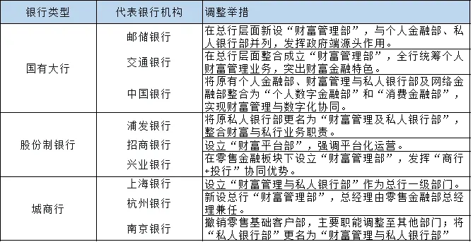 国有大型银行层面看,其调整的驱动力主要是服务全民财富,承担“头雁”责任。国有大行往往会借助广泛的网点与客群基础,自上而下推动转型,比如邮储、交行在总行层面设立独立一级部门,再如中行实施跨条线大整合等等。
