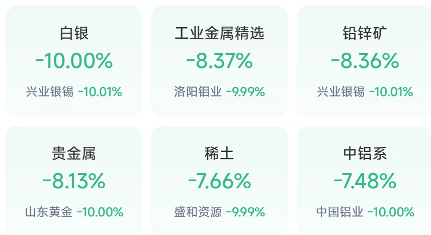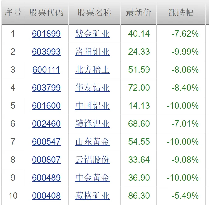 高位的有色金属和资源股大跌了,我截图有色金属ETF前10持仓的股票跌幅给大家看一下: