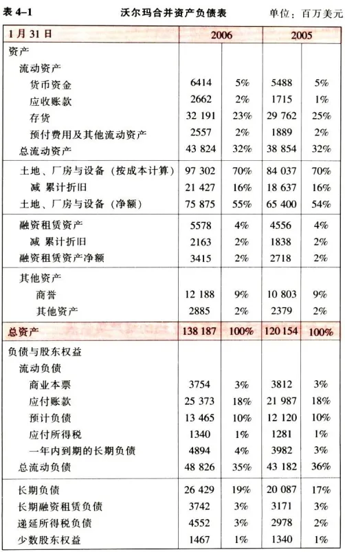 扼要地解释沃尔玛资产负债表的会计科目后,我们利用它2006年的数据,简单地确认