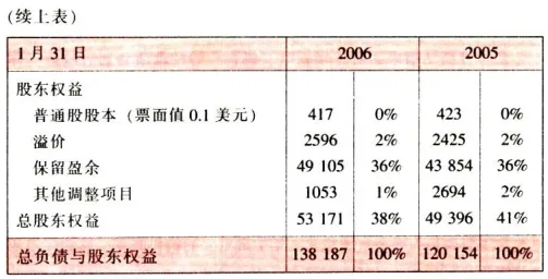 沃尔玛资产负债表的期末时点设定为 1 月 31 日,但缴纳上年度税负的时间为当年 7 月份,因此沃尔玛会先在期末认列自行估计的应缴纳税金额。2006 年,沃尔玛该项目约为 13.4 亿美元,占总资产的