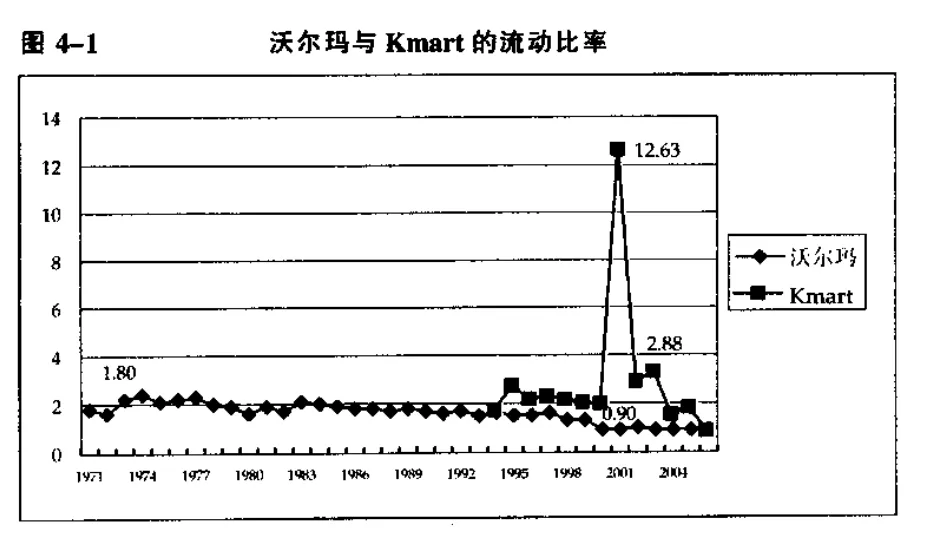 传统的财务报表分析强调企业的偿债能力,要求企业的流动比率至少在 1.5 以上。然而,由竞争力的角度着眼,能以小于 1 的流动比率(营运资金为负数)来经营,显示了沃尔玛强大的管理能力;至于突然攀高的流动比率(例如 2000 年 Kmart 的数字),反而是通路业财务危机的警讯。