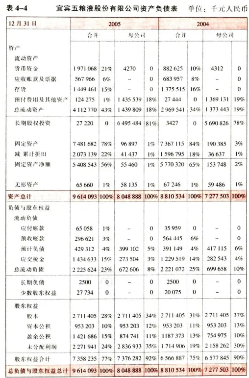 我们现在以五粮液 2005 年的资产负债表为例子。