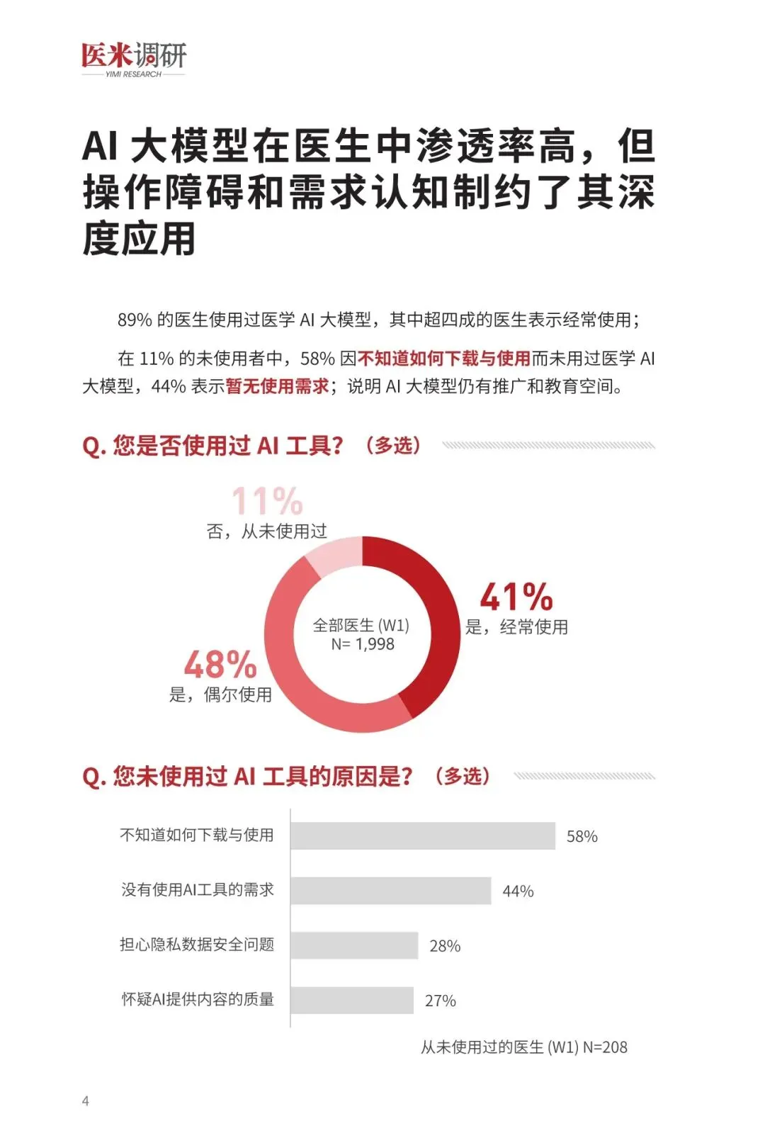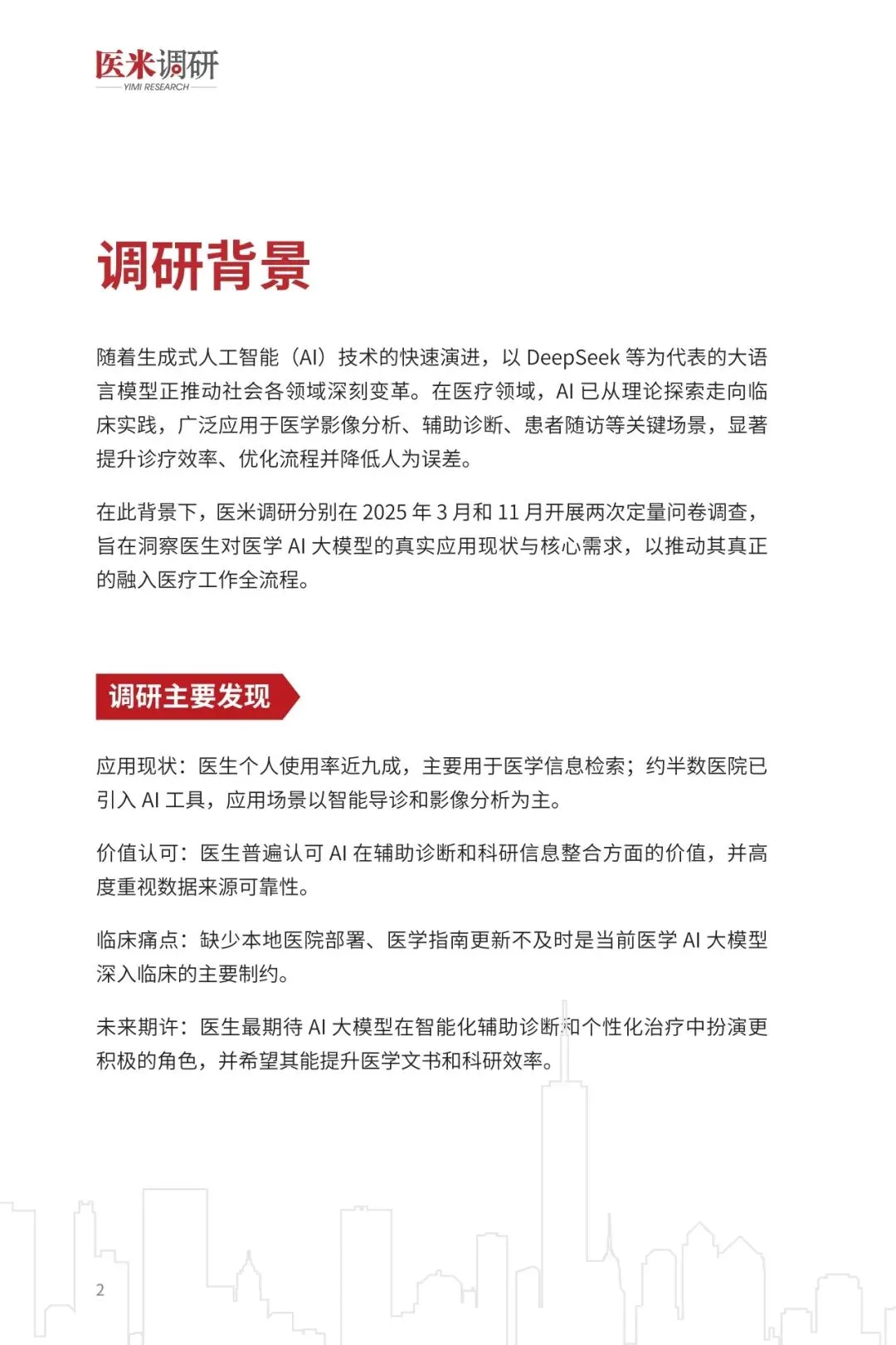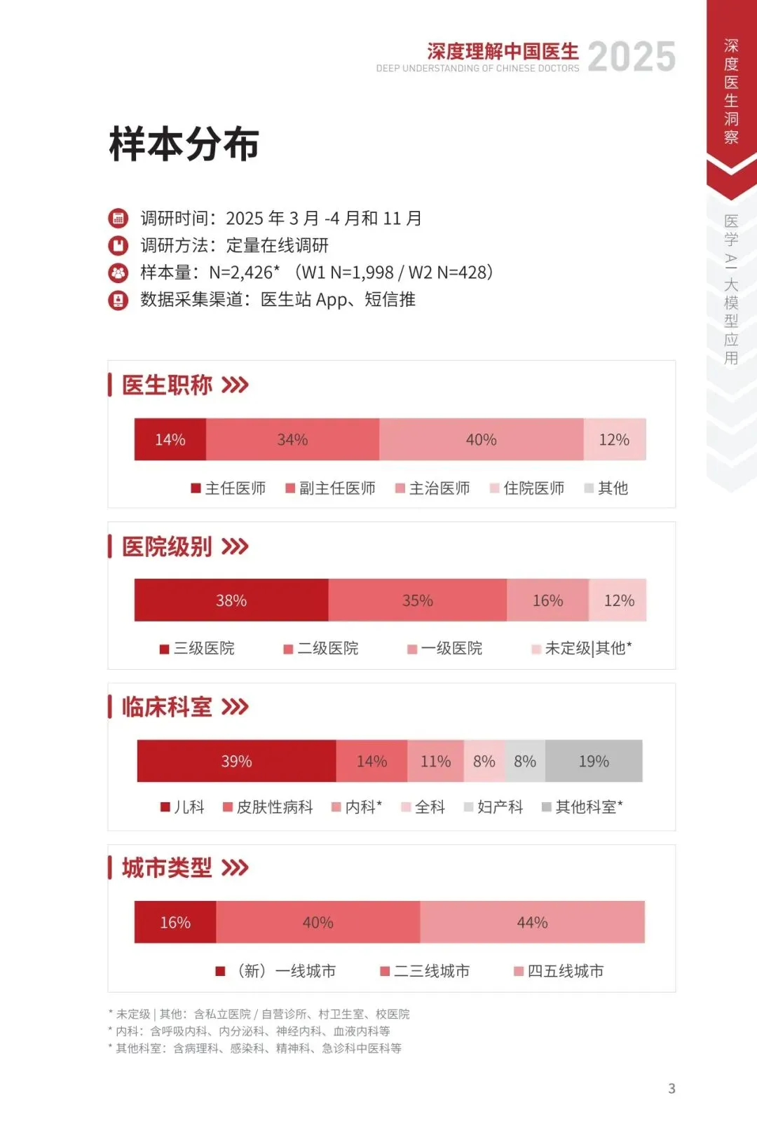 随着生成式人工智能技术的飞速演进,医学AI大模型正从理论探索迈向临床实践,深刻重塑着医疗行业的诊疗模式与效率边界。为深入洞察中国医生对AI技术的应用现状与核心诉求,“医学界-医米调研”于2025年3月和11月分别开展两次定量问卷调查,覆盖2426名来自不同职称、科室及医院层级的医生,形成了具备广泛代表性的行业洞察报告。