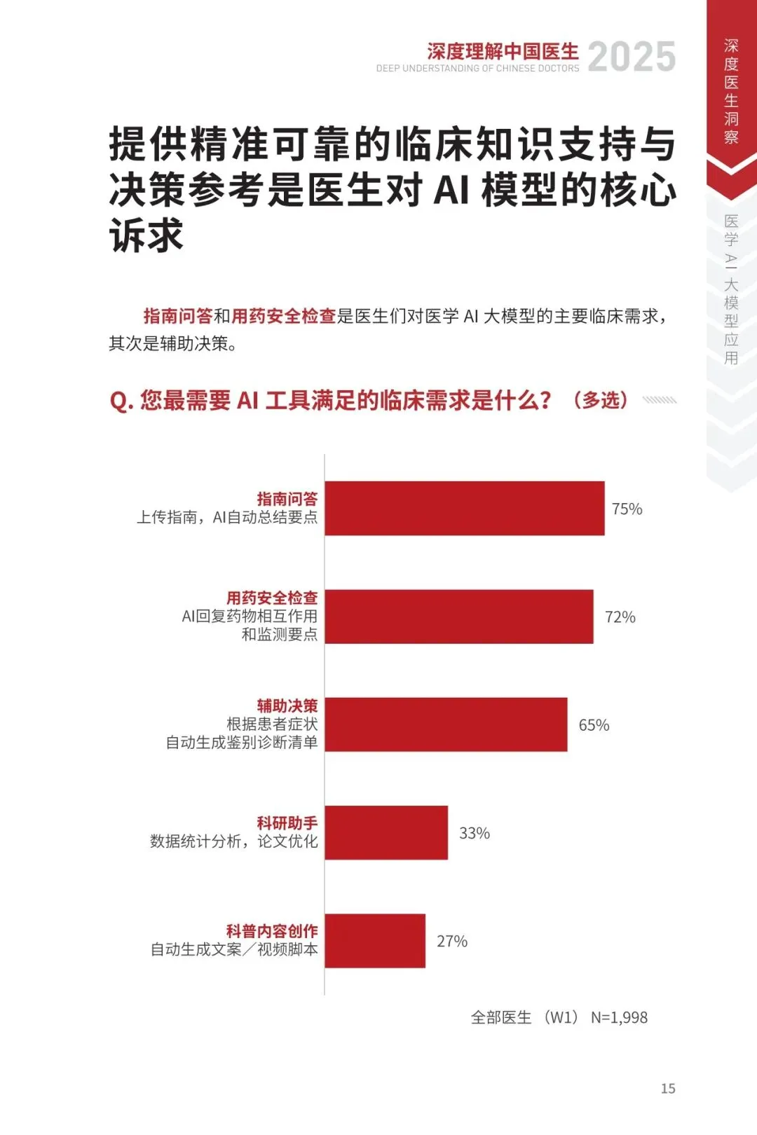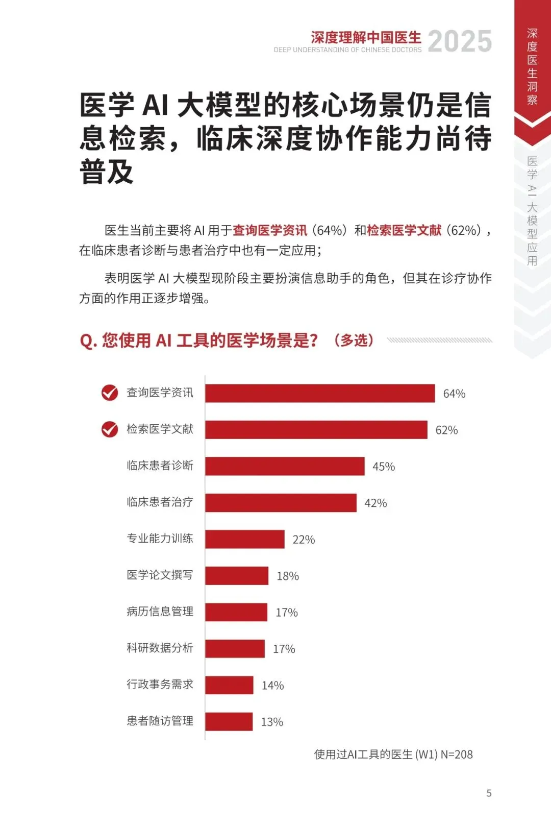 综上所述,AI正在逐步融入中国医生的日常实践,从信息检索到临床辅助,展现出多层次的应用前景。未来,如何突破落地瓶颈、强化数据可信度、实现技术与临床需求的深度融合,将是推动医学AI真正赋能医疗体系的关键所在。