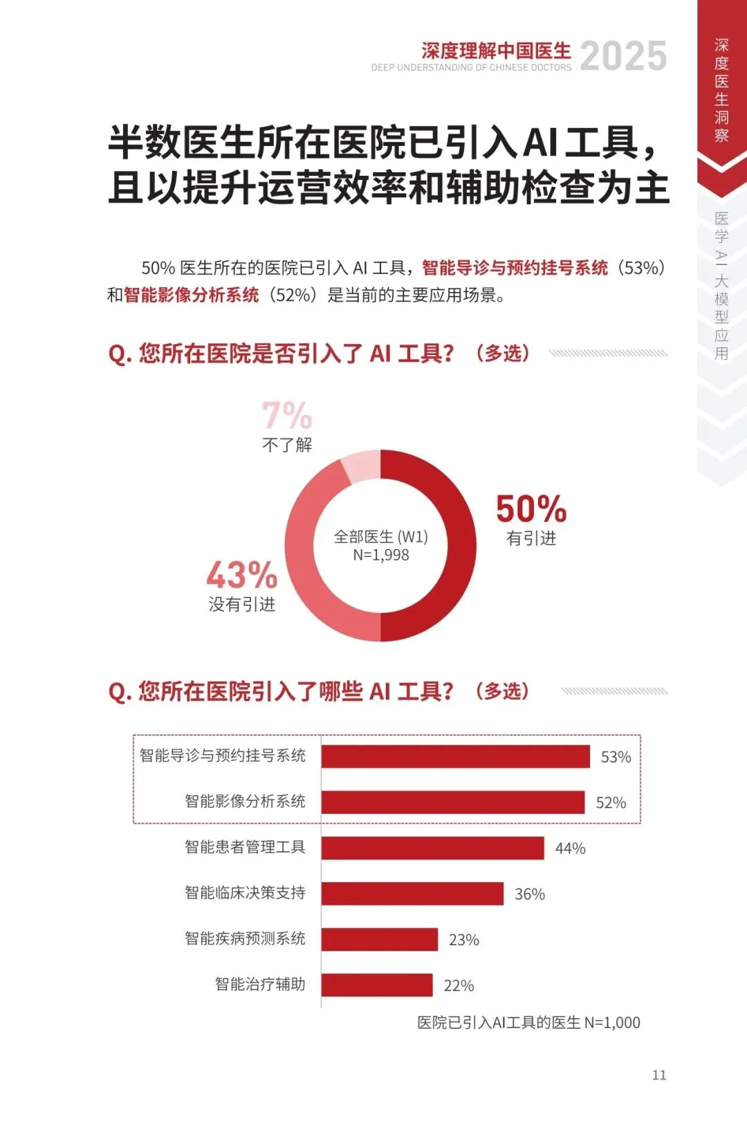 调研显示,AI大模型在医生群体中的渗透率已处于较高水平。近九成医生表示个人曾使用过AI工具,其主要用途集中在医学信息检索方面。与此同时,约半数受访医生所在医院已正式引入AI工具,应用场景以智能导诊和影像分析为主,体现出AI在提升诊疗流程效率方面的初步价值。