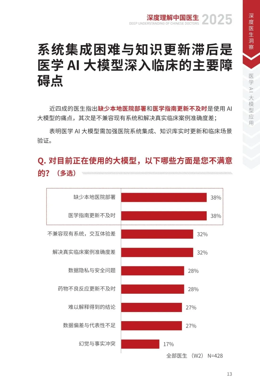 尽管AI应用初见成效,但调研也揭示了当前落地过程中仍存在的制约因素。缺少本地化医院部署、医学指南更新不及时等问题,限制了AI技术在临床中的深度整合与应用。展望未来,医生最期待AI大模型能在智能化辅助诊断和个性化治疗方案制定中发挥更积极的作用。同时,提升医学文书撰写效率与科研数据处理能力,也成为医生对AI发展的普遍期待。