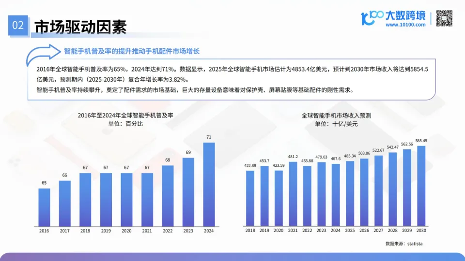 - 核心驱动力:智能手机普及率持续提升(2024年达71%)、用户换机周期拉长(美国平均2.81年),催生了对配件的持续性需求。