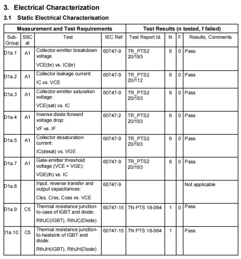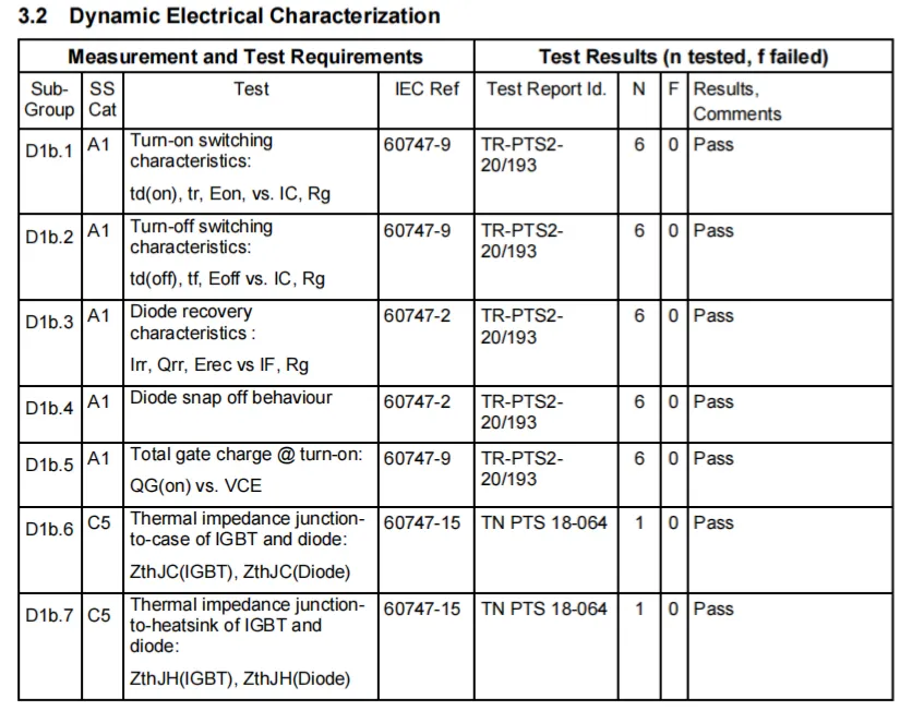 :测试了开通开关特性(td(on), tr, Eon, vs. IC, Rg)、关断开关特性(td(off), tf, Eoff vs. IC, Rg)、二极管恢复特性(Irr, Qrr, Erec vs IF, Rg)、二极管 snap off 行为、开通时总栅极电荷(QG(on) vs. VCE)、IGBT和二极管的结壳热阻抗(ZthJC(IGBT), ZthJC(Diode))、IGBT和二极管的结散热器热阻抗(ZthJH(IGBT), ZthJH(Diode))。