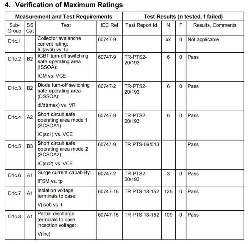 :包括IGBT关断开关安全工作区(ISSOA)(ICM vs. VCE)、二极管关断开关安全工作区(DSSOA)(di/dt(max) vs. VR)、短路安全工作区模式1(SCSOA1)(IC(sc1) vs. VCE)、浪涌电流能力(IFSM vs. tp)、端子到外壳的隔离电压(V(isol) vs. t)、端子到外壳的局部放电起始电压(V(inc))等。其中,集电极雪崩电流额定值(IC(aval) vs. tp)不适用;短路安全工作区模式2(SCSOA2)(IC(sc2) vs. VCE)测试结果为通过。