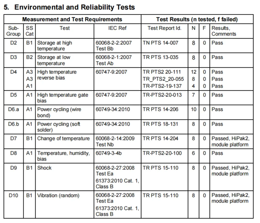 :涵盖高温存储、低温存储、高温反向偏置、高温栅极偏置、功率循环(引线键合)、功率循环(软焊料)、温度变化、温湿度偏置、冲击、振动(随机)等。