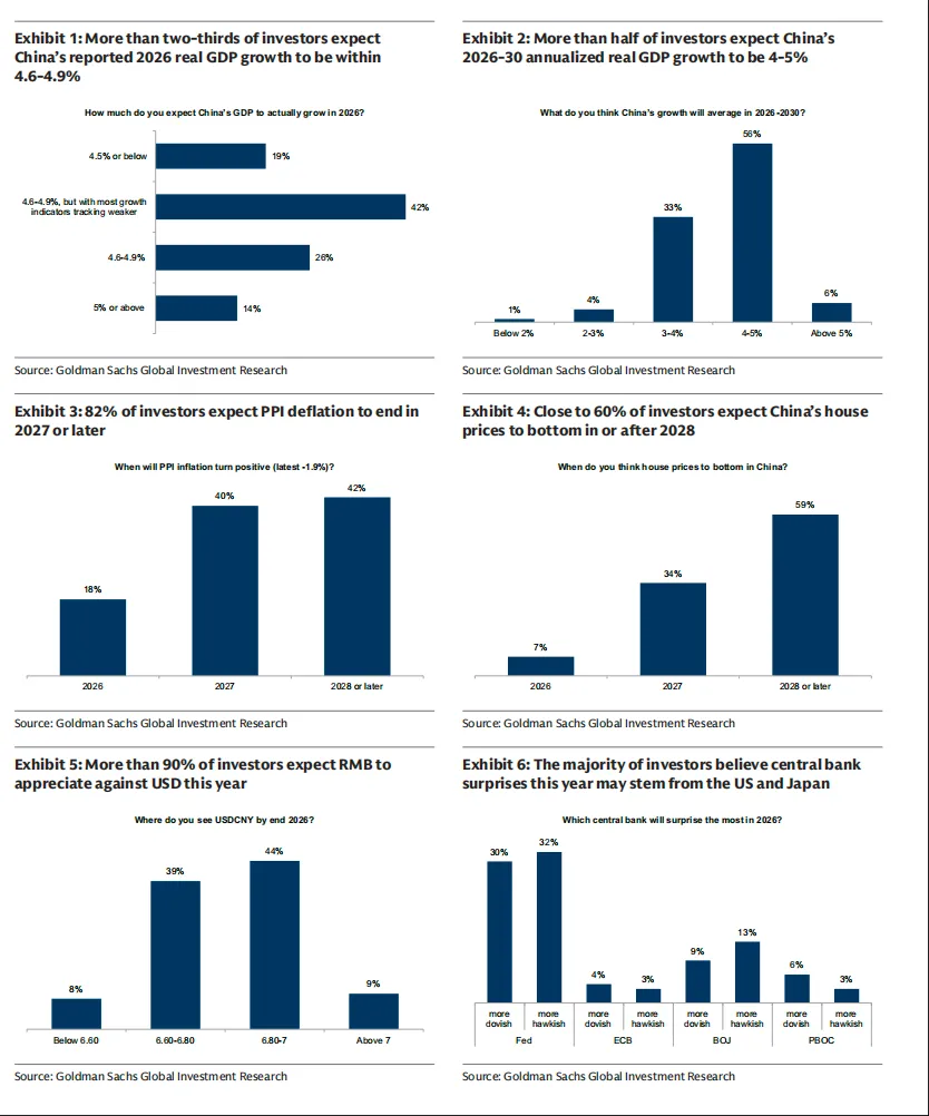 我们于1月27-28日在香港举办了2026年亚太全球宏观会议。期间我们举行了三场以中国为主题的小组讨论,会见了众多国内和全球投资者,并就中国经济、政策和市场的看法对参会者进行了调查。与去年年初我们举办2025年全球宏观会议时相比,考虑到出口韧性和人工智能的突破,投资者对中国中期增长前景的悲观情绪似乎有所减弱,对中国股市和人民币汇率更为看好,但对国内需求、再通胀和政策执行更加谨慎。我们在客户会议中最常被问及的问题包括对“两会”、“十五五”规划、房地产市场和消费政策、出口强劲的可持续性、PPI通缩/再通胀以及人民币汇率的预期。