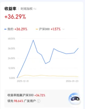 1月累计收益率:+36.29%,跑赢沪深300指数34.72个百分点,在广发证券用户中排名前1.36%。