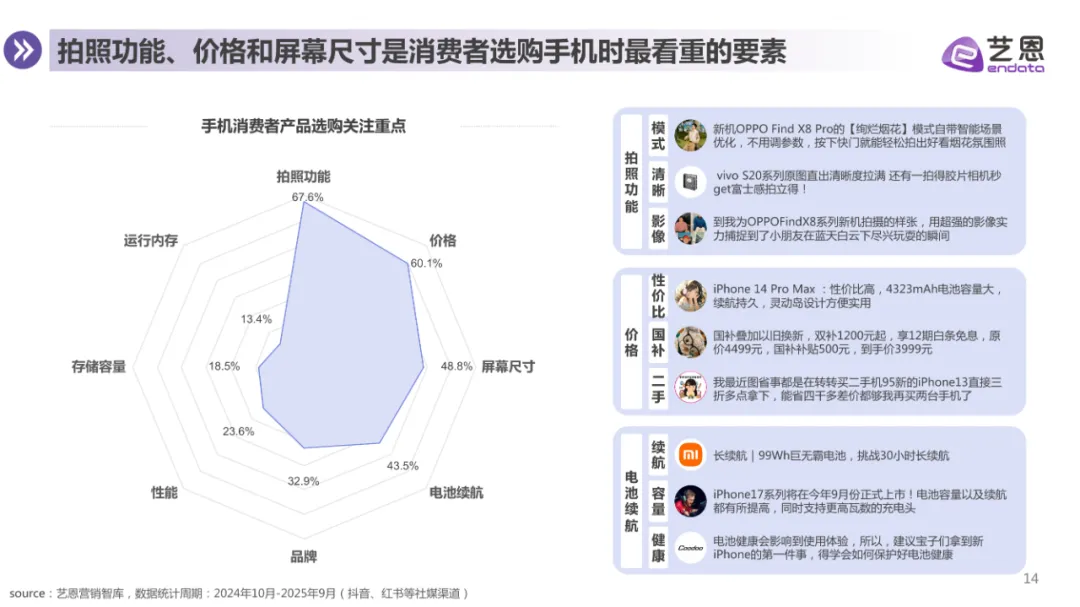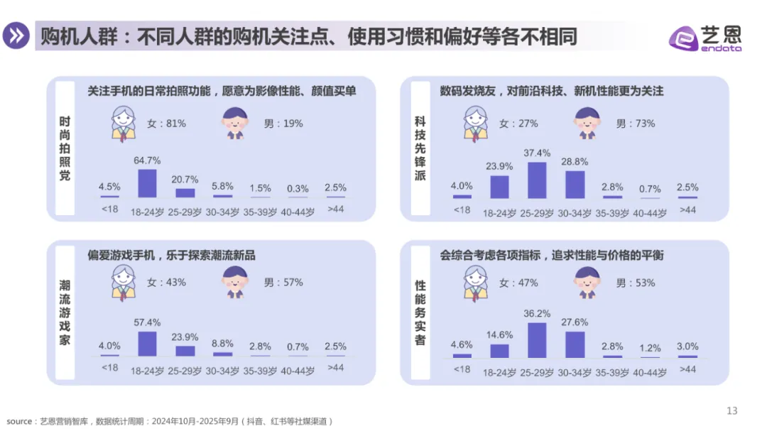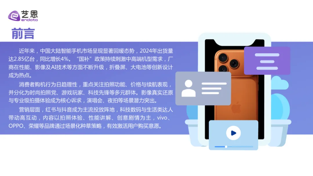 2024年中国大陆智能手机市场整体呈现回暖趋势,全年出货量达到2.85亿台,较前一年增长4%。vivo在竞争中表现突出,华为与苹果紧随其后。从2022年第一季度至2024年第四季度的数据看,各品牌市场份额波动明显,部分品牌出现小幅下滑,但整体市场仍保持稳定增长。消费者购机行为更加理性,对拍照功能、价格和续航能力的关注度持续提升。不同用户群体逐渐形成鲜明特征,如注重时尚与拍照的用户、追求高性能的游戏用户以及热衷前沿科技的先锋群体。影像真实还原与专业拍摄体验成为核心需求,演唱会拍摄、夜间摄影等场景展现出较大发展潜力。营销方面,红书与抖音成为主要推广平台,科技数码类与生活类达人通过内容互动有效吸引用户。以拍照体验、性能展示和创意剧情为主的内容形式,成为品牌吸引潜在消费者的有力工具。vivo、OPPO、荣耀等品牌借助场景化种草策略,成功激发用户的购买兴趣。