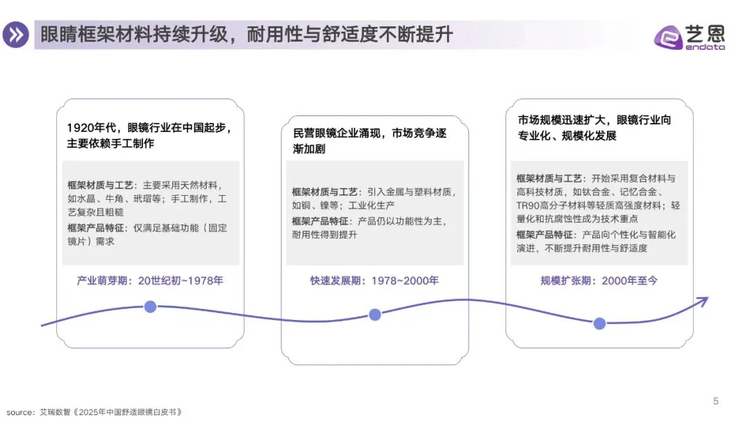 1. 规模与材料:2025E框架镜零售端规模约680亿元,同比+9%;钛合金、TR90高分子材质占比已升至43%,镜架平均重量降至≤7g。