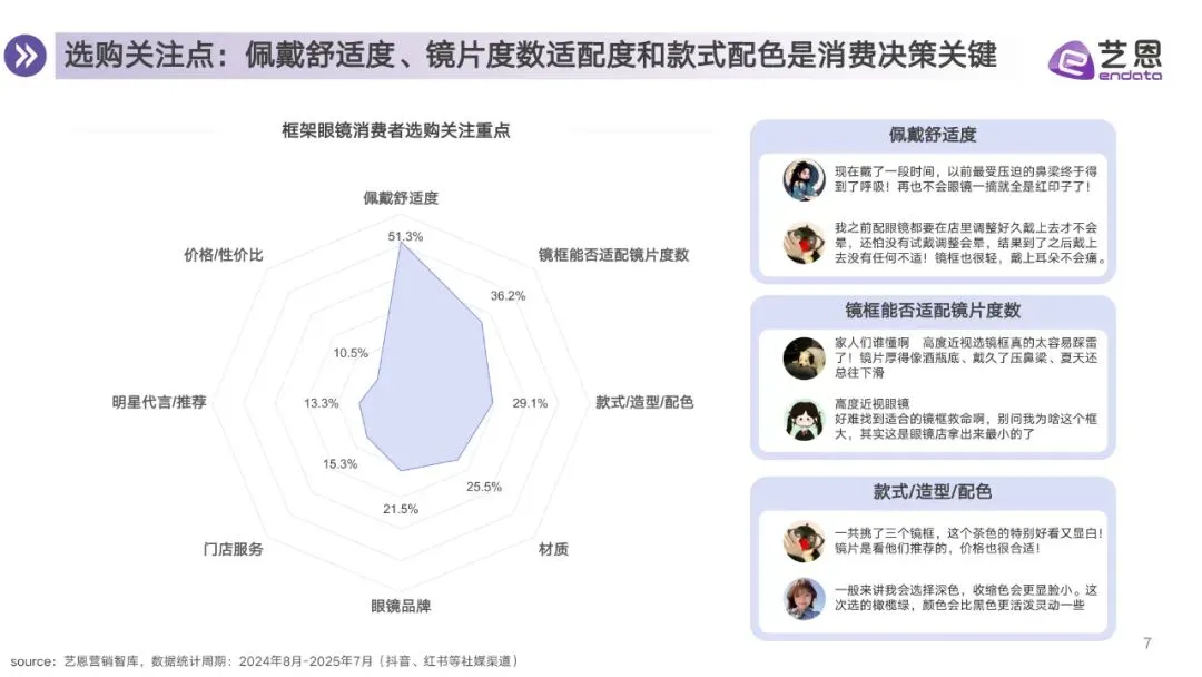 2. 需求痛点:51%消费者首要看“佩戴舒适度”,23.8%反馈“镜腿压耳”最严重,19.5%抱怨“鼻梁压痕”。