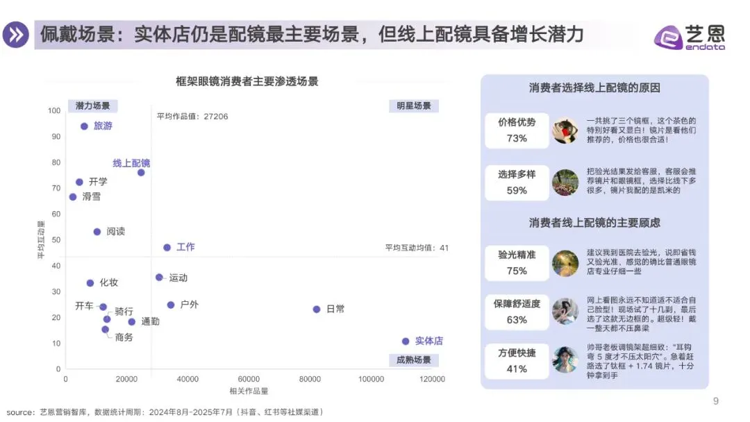3. 场景与渠道:实体店仍占73%配镜场景,但线上配镜因“价格优势+款式丰富”渗透率达27%,同比+5pcts。