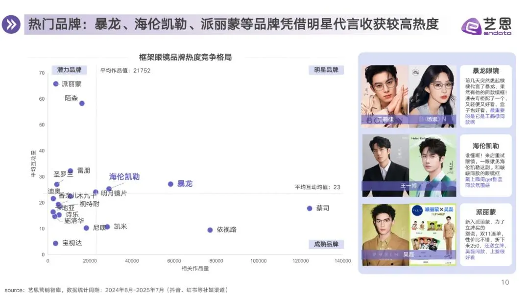 4. 品牌格局:暴龙、海伦凯勒、派丽蒙凭明星代言包揽互动量TOP3,暴龙近一年红书+抖音互动8.4万,其中王鹤棣同款贡献42%。